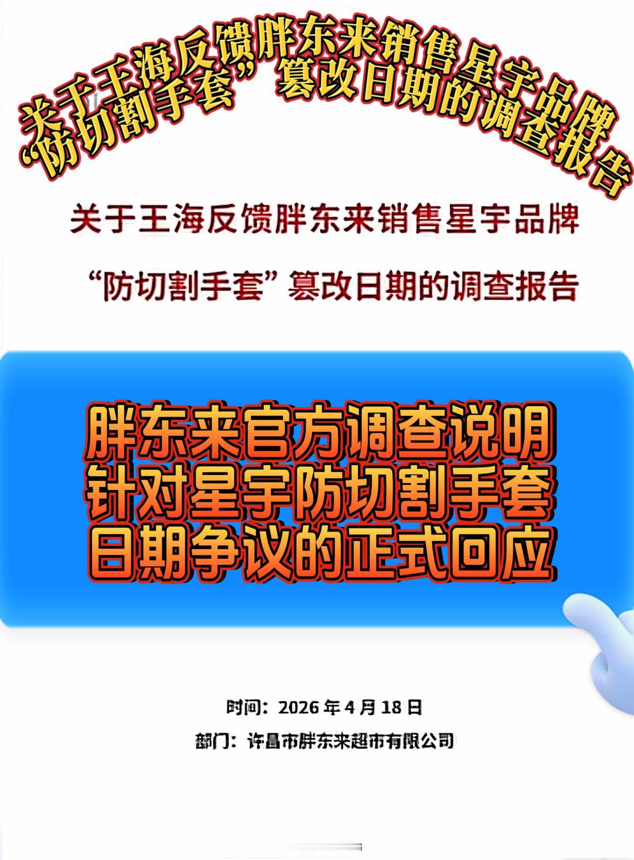 关于王海反馈胖东来销售星宇品牌“防切割手套”篡改日期的调查报告胖东来官方回应防切割手套日期争议这是份关于防切手套日期的调查报告。