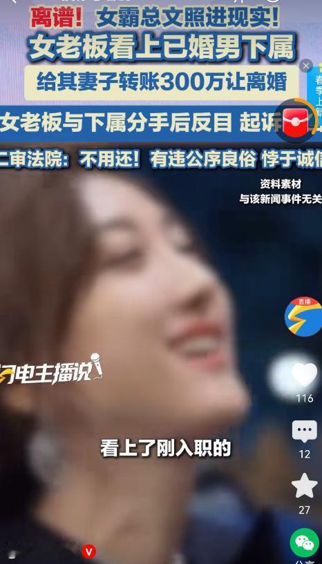 重庆,一女老板看上了自己的男下属,这男的也禁不住诱惑,他们二人常常饥渴难耐,总是背着自己的另一半三番五次在外偷腥,越陷越深。女老板不想偷偷摸摸了,她说让男人离婚,自己也离婚,然后光明正大在一起,为了让男方快点脱身,她狂甩300万给男方妻子作为分手费,然而重获自由的二人并没有常远地走下去,同居后没多久,他们分开了,生气的女老板把男子和他的前妻都告了,一审判决男子前妻返回女老板欠款,二审有不同看法。