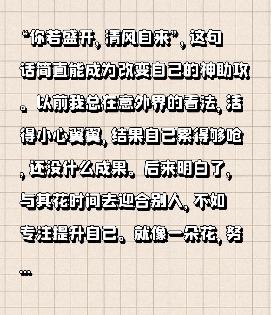 “你若盛开,清风自来”,这句话简直能成为改变自己的神助攻。以前我总在意外界的看法,活得小心翼翼,结果自己累得够呛,还没什么成果。后来明白了,与其花时间去迎合别人,不如专注提升自己。就像一朵花,努力绽放自己的美丽,自然会吸引来蜜蜂和蝴蝶。我开始学习新技能,坚持运动,丰富自己的内心世界。慢慢地,生活开始有了变化,机会也多了起来。所以啊,别总盯着外面,先让自己强大,美好自会降临。