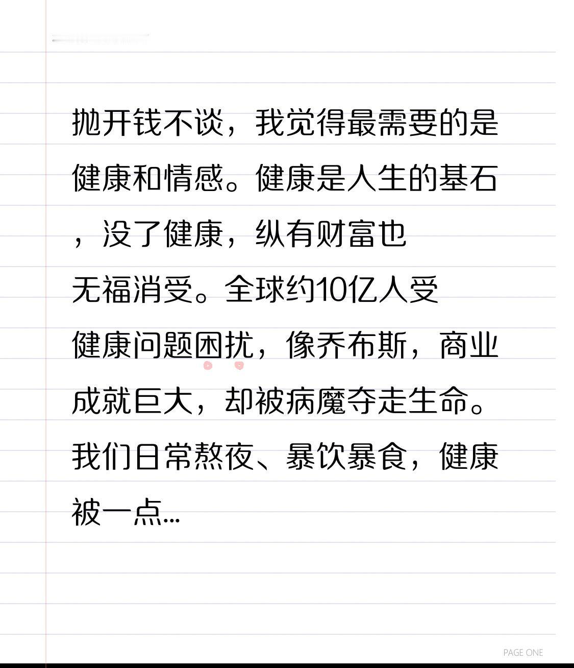 抛开钱不谈,我觉得最需要的是健康和情感。健康是人生的基石,没了健康,纵有财富也无福消受。全球约10亿人受健康问题困扰,像乔布斯,商业成就巨大,却被病魔夺走生命。我们日常熬夜、暴饮暴食,健康被一点点侵蚀,所以得关注身体,保持健康生活方式。