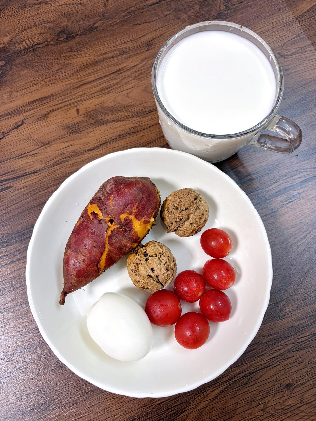 今日减脂早餐:红薯+鸡蛋+番茄+核桃+牛奶