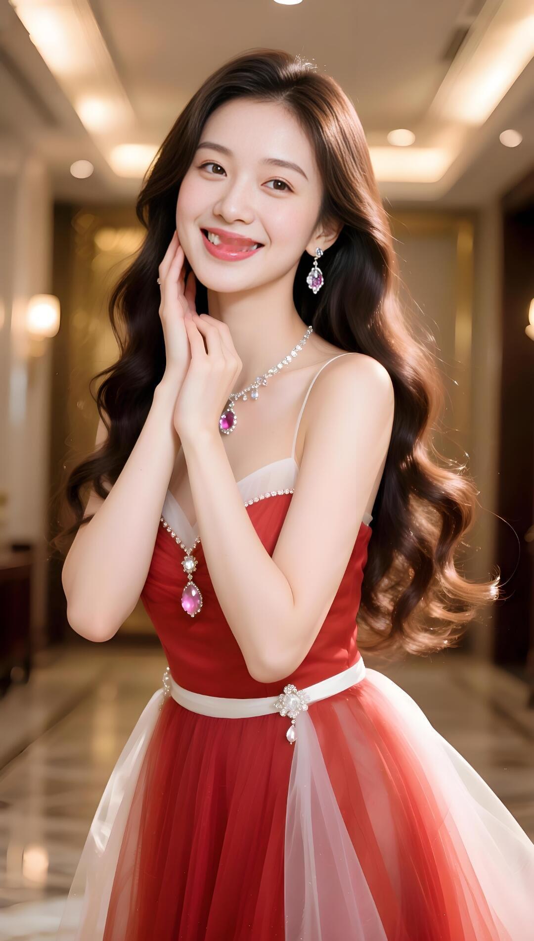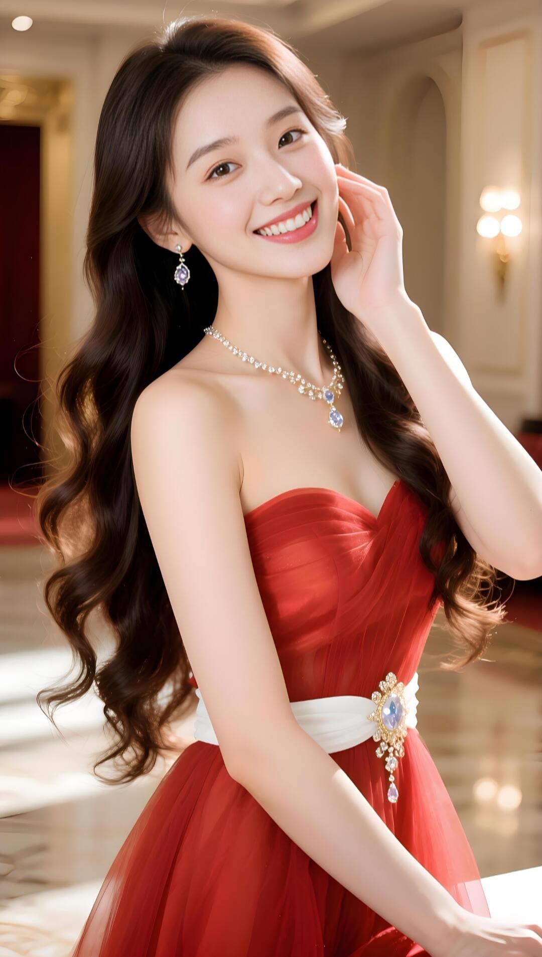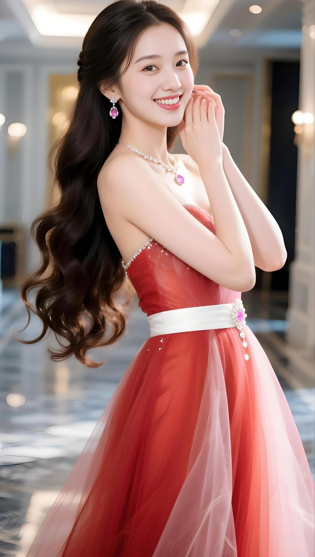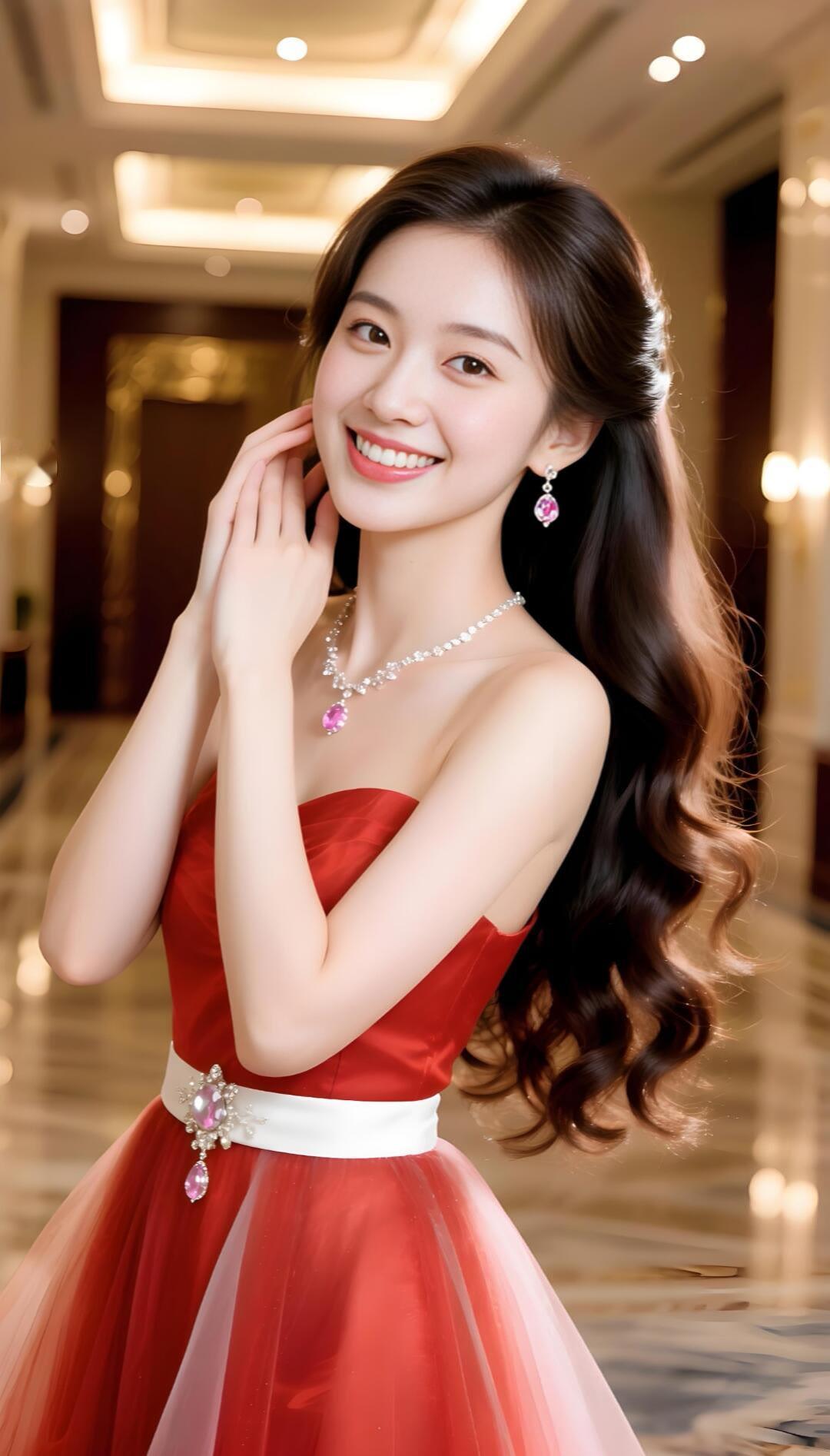 优雅红裙,闪耀珠宝,微笑的美丽瞬间