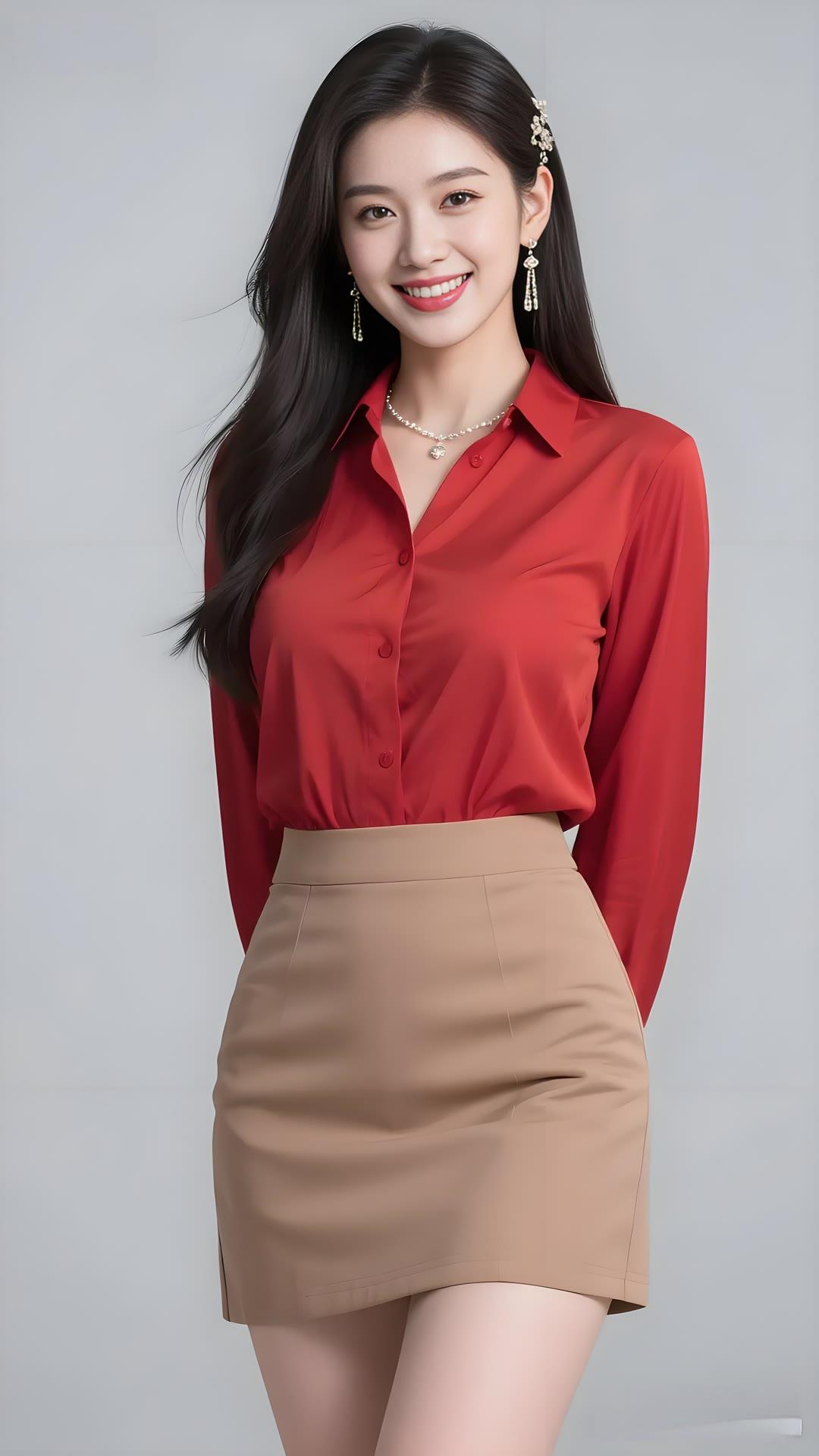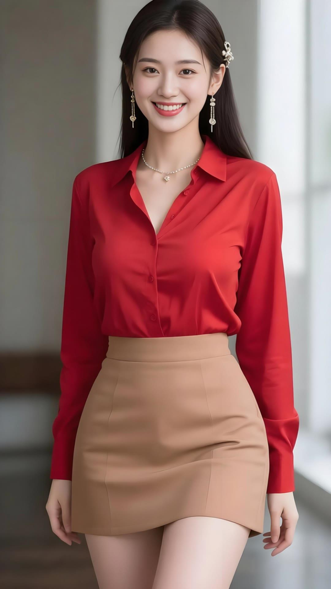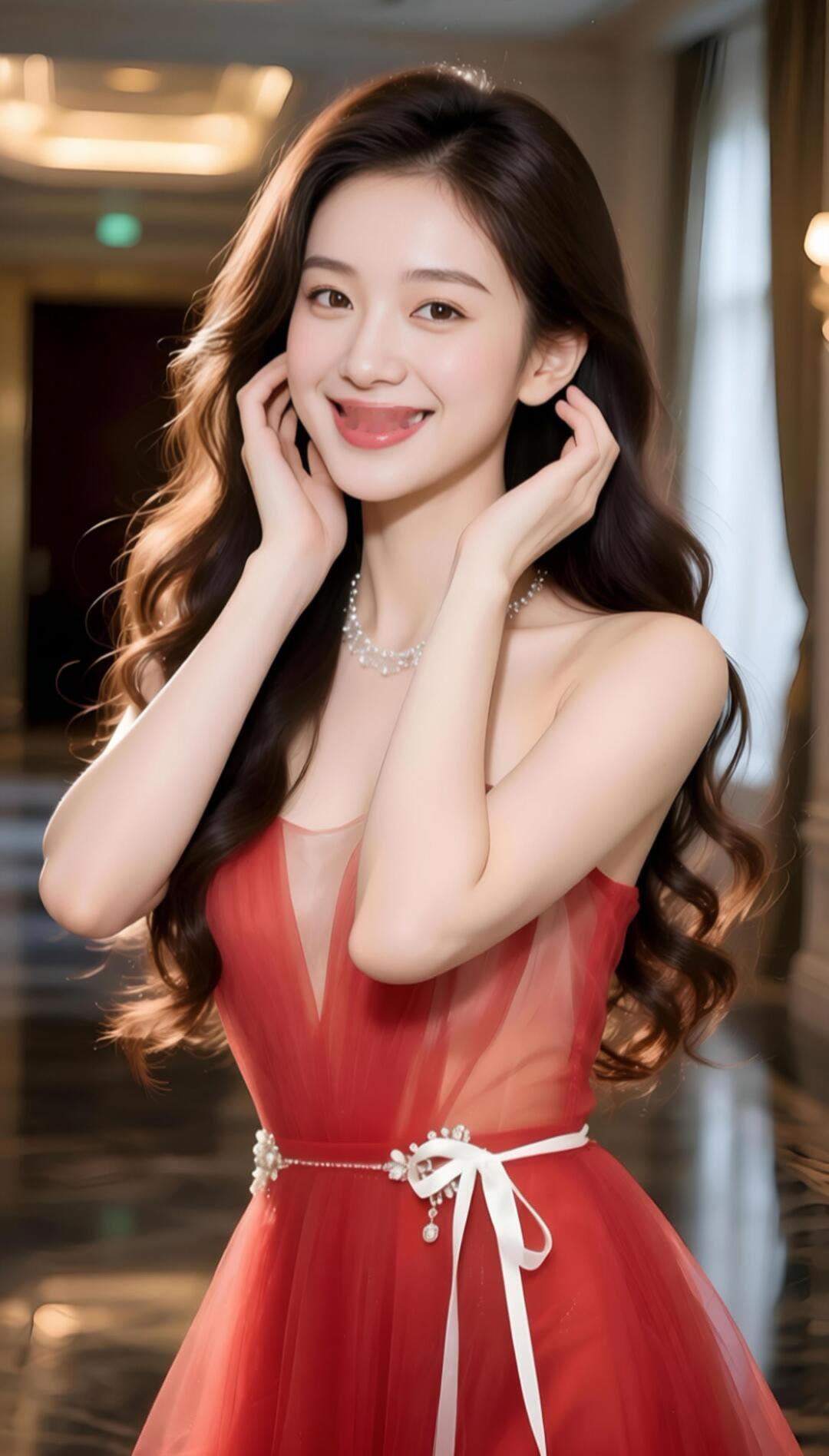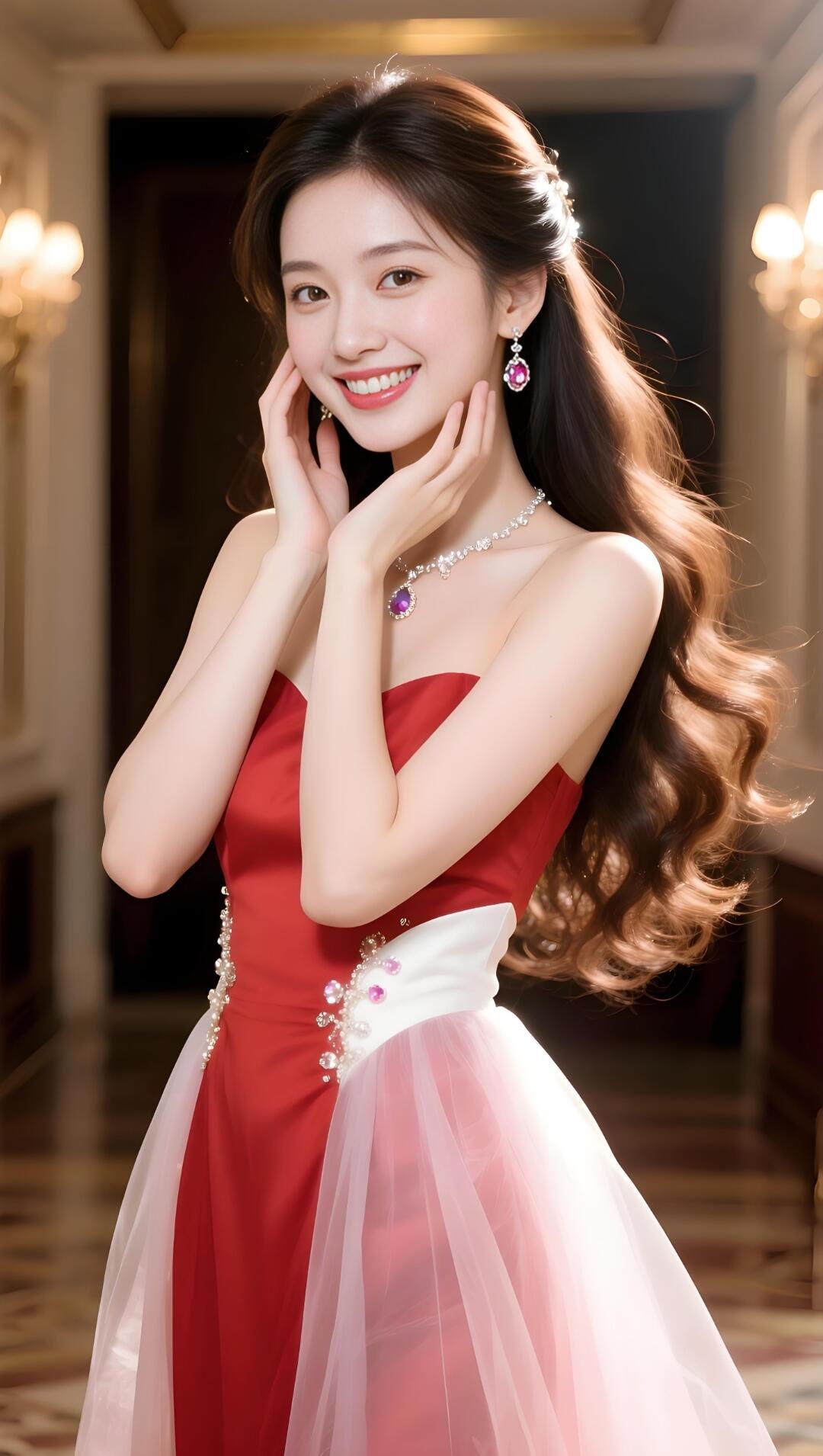 优雅红裙,闪耀珠宝,微笑的美丽瞬间