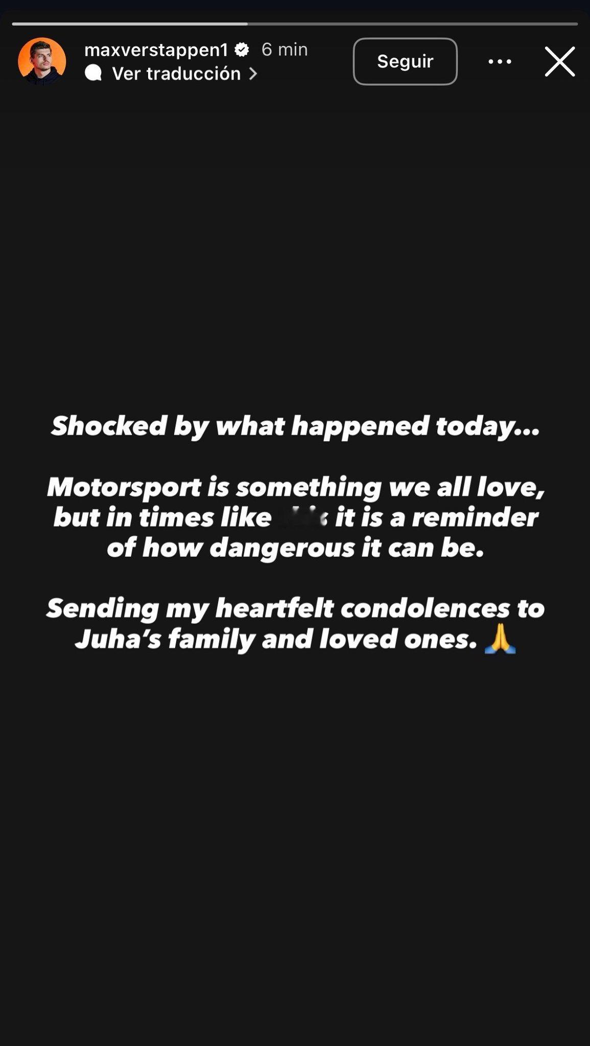 参与本场比赛的维斯塔潘在Ins上发文对其表示哀悼,提醒汽车运动的危险性。