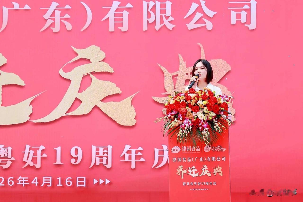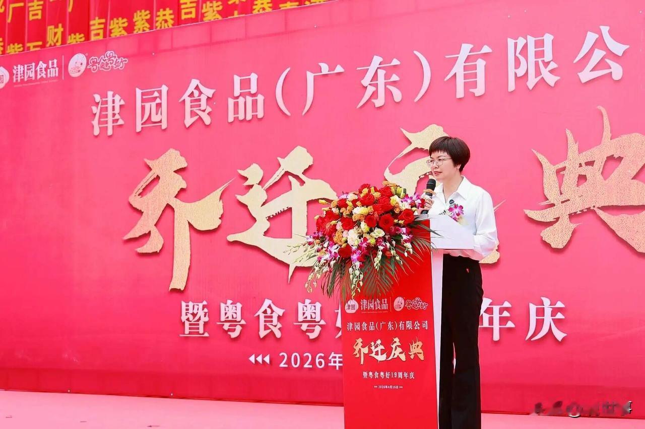 庆典伊始,津园食品(广东)有限公司总经理江雪琼发表致辞。她首先向莅临现场的各位领导、嘉宾及合作伙伴表示热烈欢迎,向长期以来关心支持企业发展的社会各界、广大客户致以衷心感谢。她表示,津园食品顺利启航、粤食粤好品牌十九载稳健前行,离不开各级政府的悉心指导、各界伙伴的携手共进与广大客户的信任支持,这份鼎力相助是企业持续发展的坚实保障与强大动力。