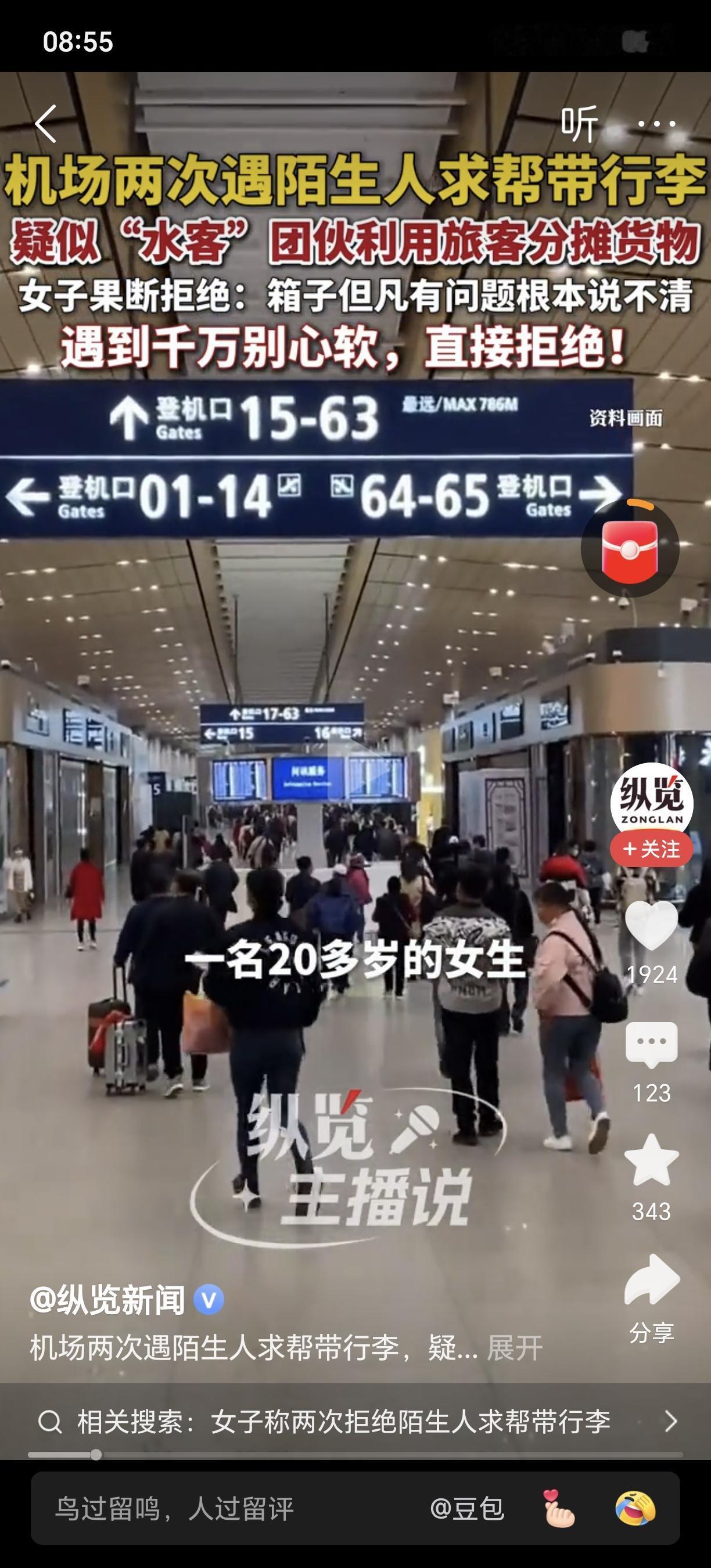 机场求帮带东西!千万警惕!不要上当!近日,媒体报道一位网友在机场,20分钟内就遇到两次陌生人求帮带东西,但是女网友对此果断拒绝,这位女网友做的太多了,一旦在机场遇到帮带东西,千万要警惕绝对不要上当。