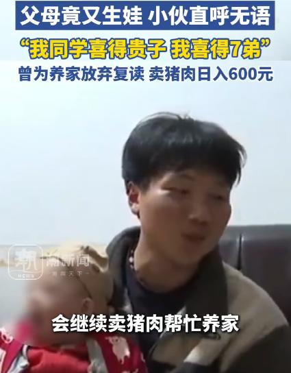 【男生回应摆摊养6弟妹父母又生娃】 摆摊养6弟妹20岁男生称会继续养家 “同学喜得贵子,我刚好喜得七弟。”近日,20岁小伙卖猪肉养6个弟弟妹妹,结果父母又生娃,小伙直呼无语。