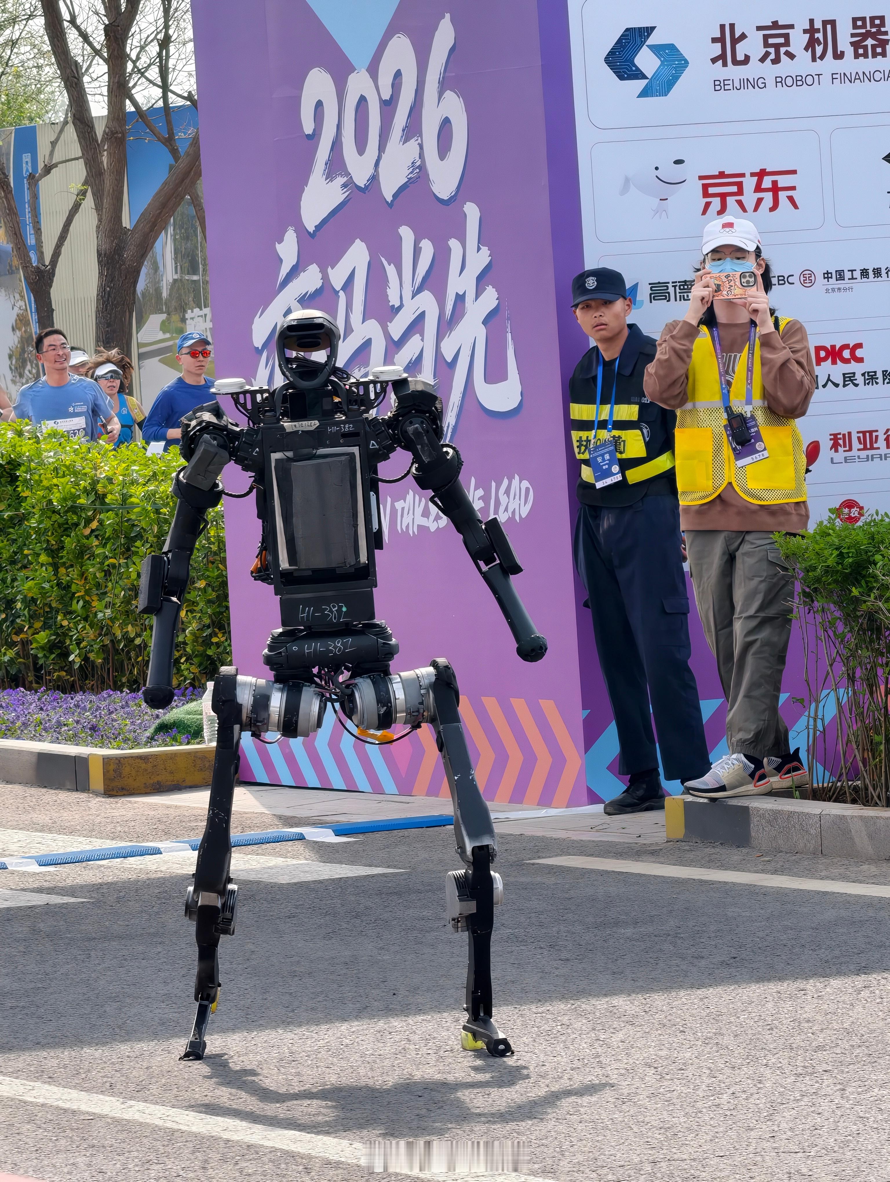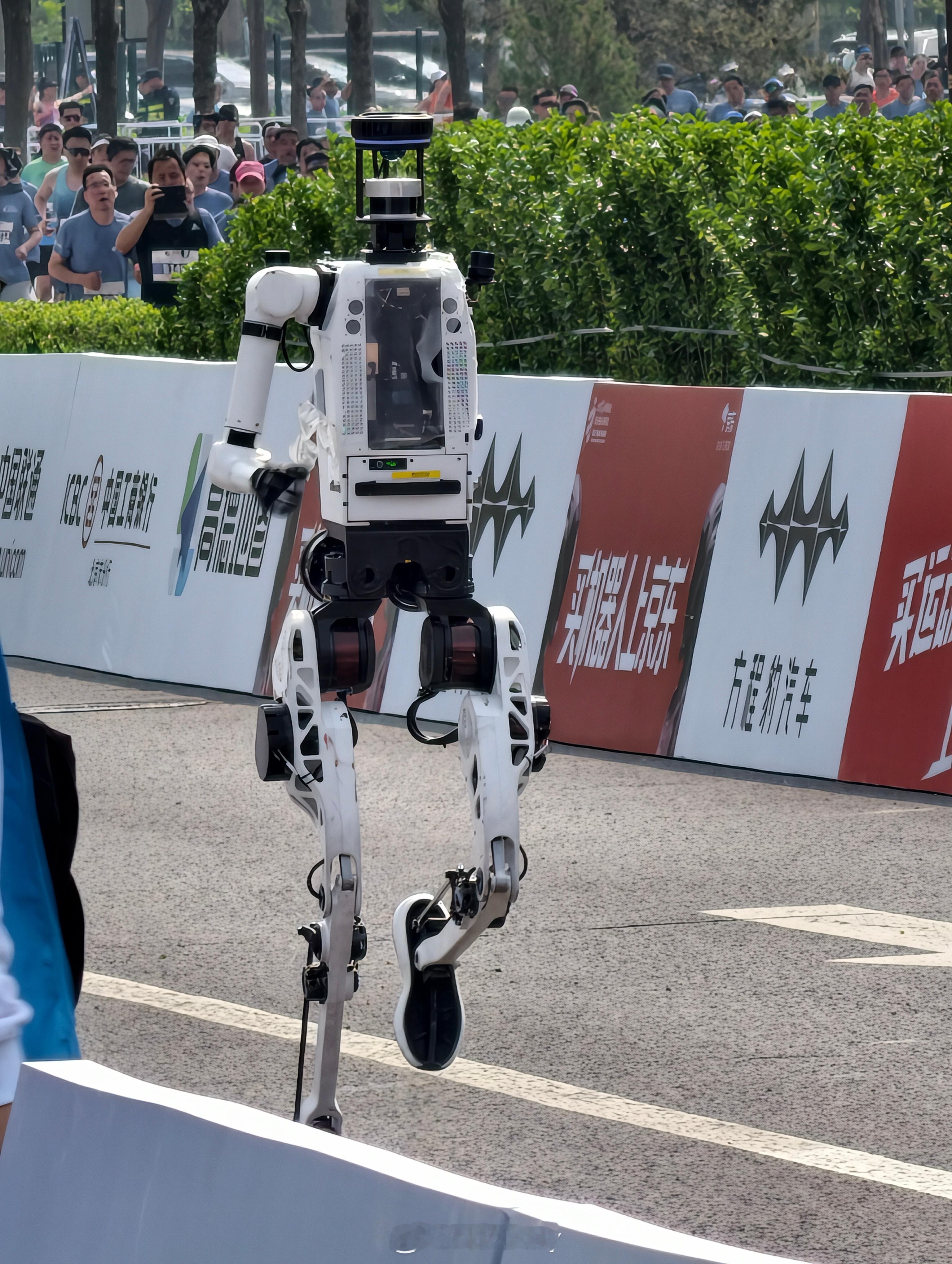 机器人终点线前摔倒 个别机器了,摔倒的是第二个冲线的,第一个稳稳到现场了。其实这不是跟人一样,有的人类跑者也会一激动摔倒,机器人已经很努力啦。今年看点还是很足的,机器人小腿倒腾的特别快。有的机器人冲线摔倒,有的机器人冲线以后走偏,有的胳膊坏了一个依然坚持完赛,这届机器人半马可有意思了。