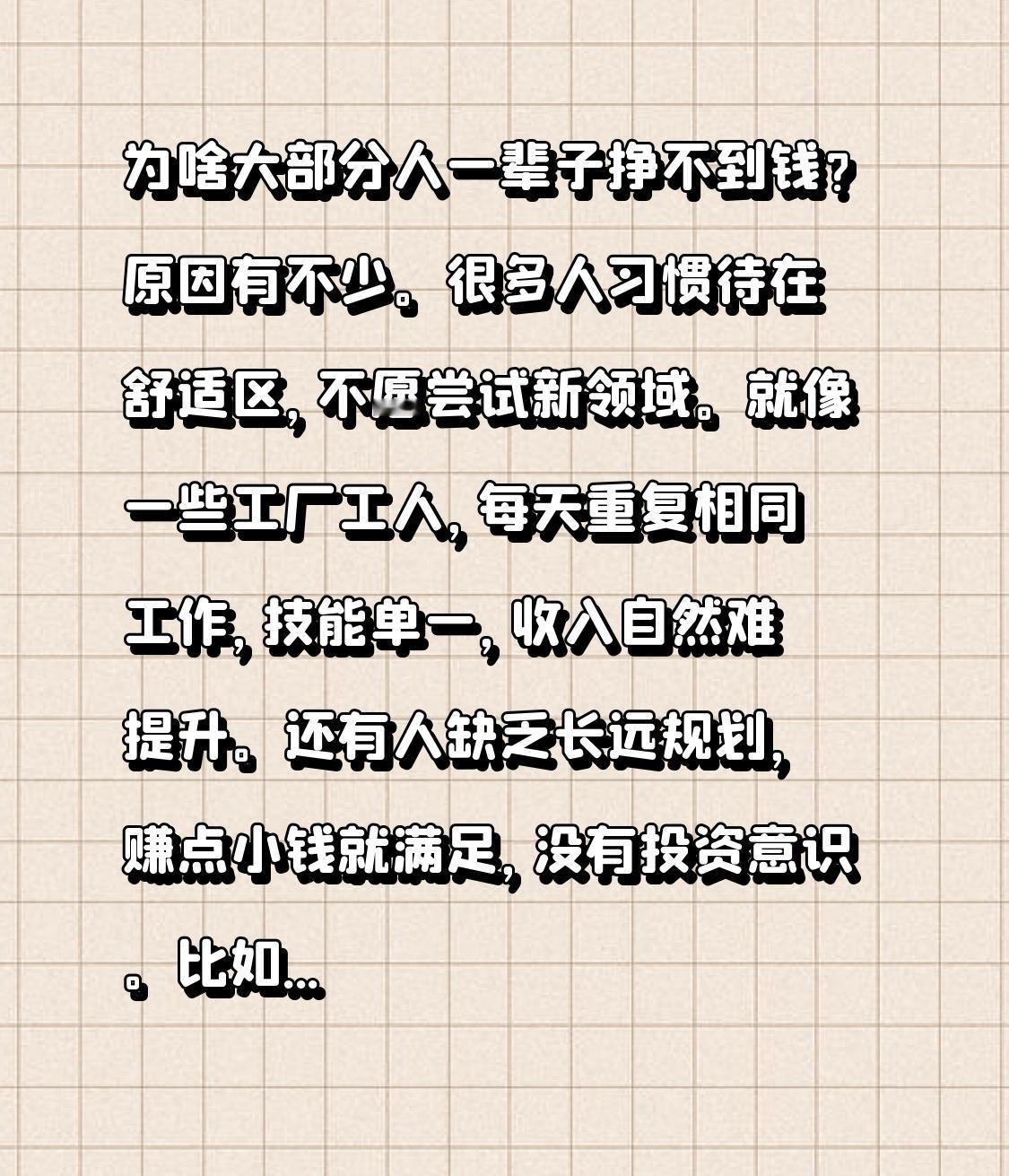 为啥大部分人一辈子挣不到钱?原因有不少。很多人习惯待在舒适区,不愿尝试新领域。就像一些工厂工人,每天重复相同工作,技能单一,收入自然难提升。