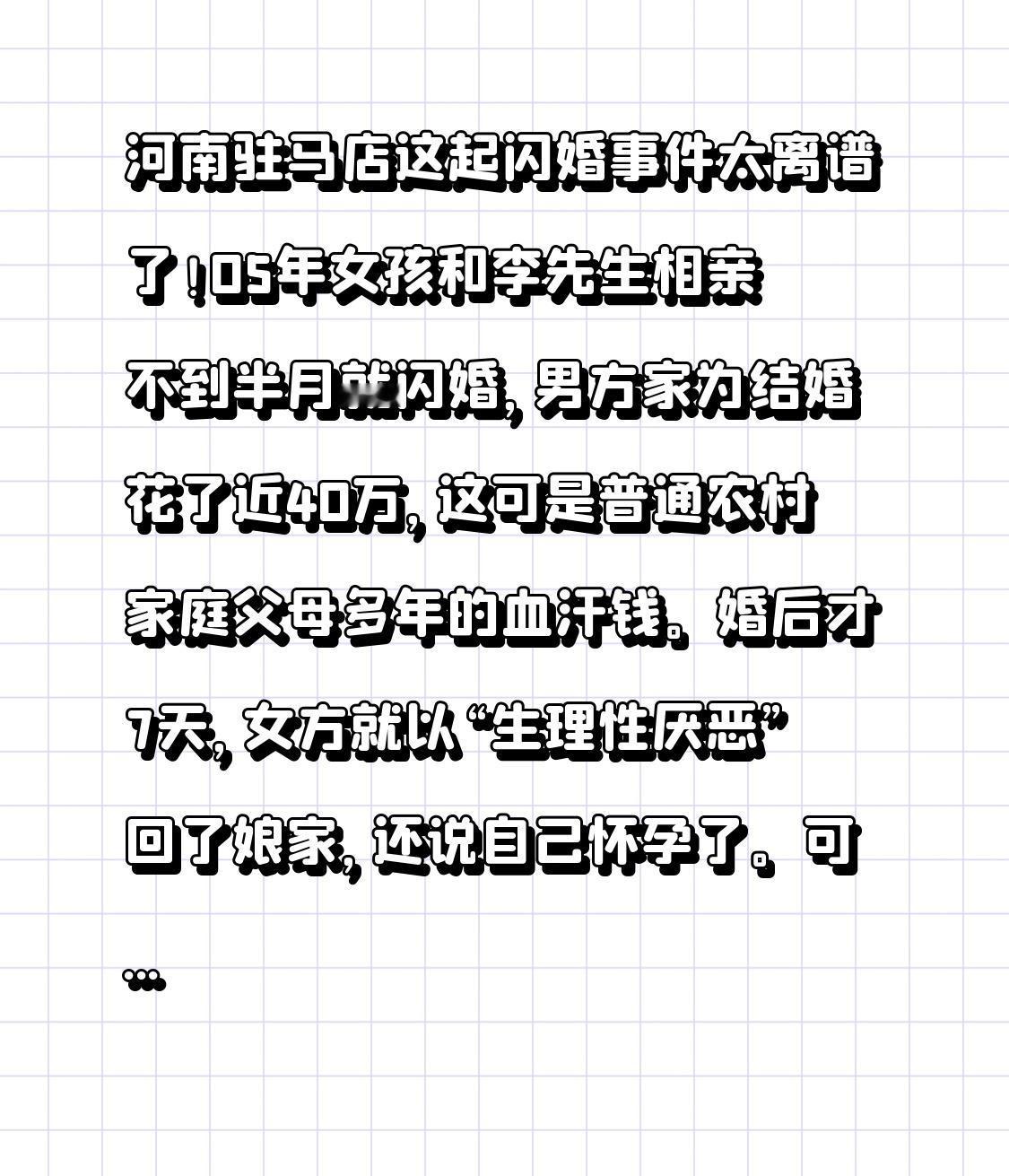河南驻马店这起闪婚事件太离谱了!05年女孩和李先生相亲不到半月就闪婚,男方家为结婚花了近40万,这可是普通农村家庭父母多年的血汗钱。