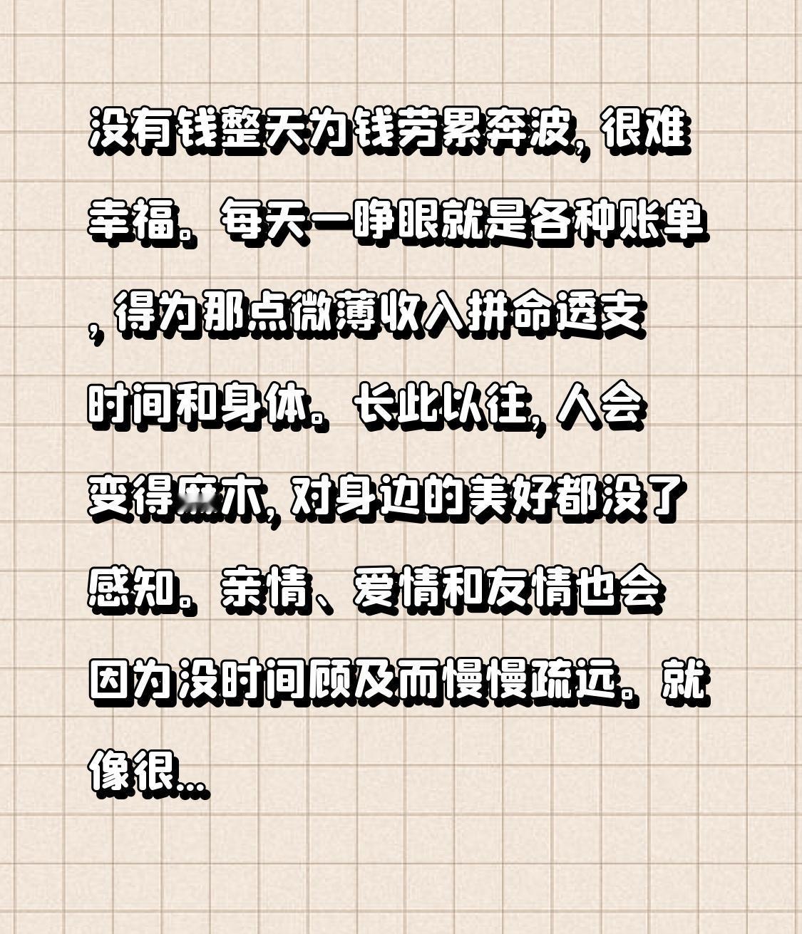 没有钱整天为钱劳累奔波,很难幸福。每天一睁眼就是各种账单,得为那点微薄收入拼命透支时间和身体。长此以往,人会变得麻木,对身边的美好都没了感知。亲情、爱情和友情也会因为没时间顾及而慢慢疏远。
