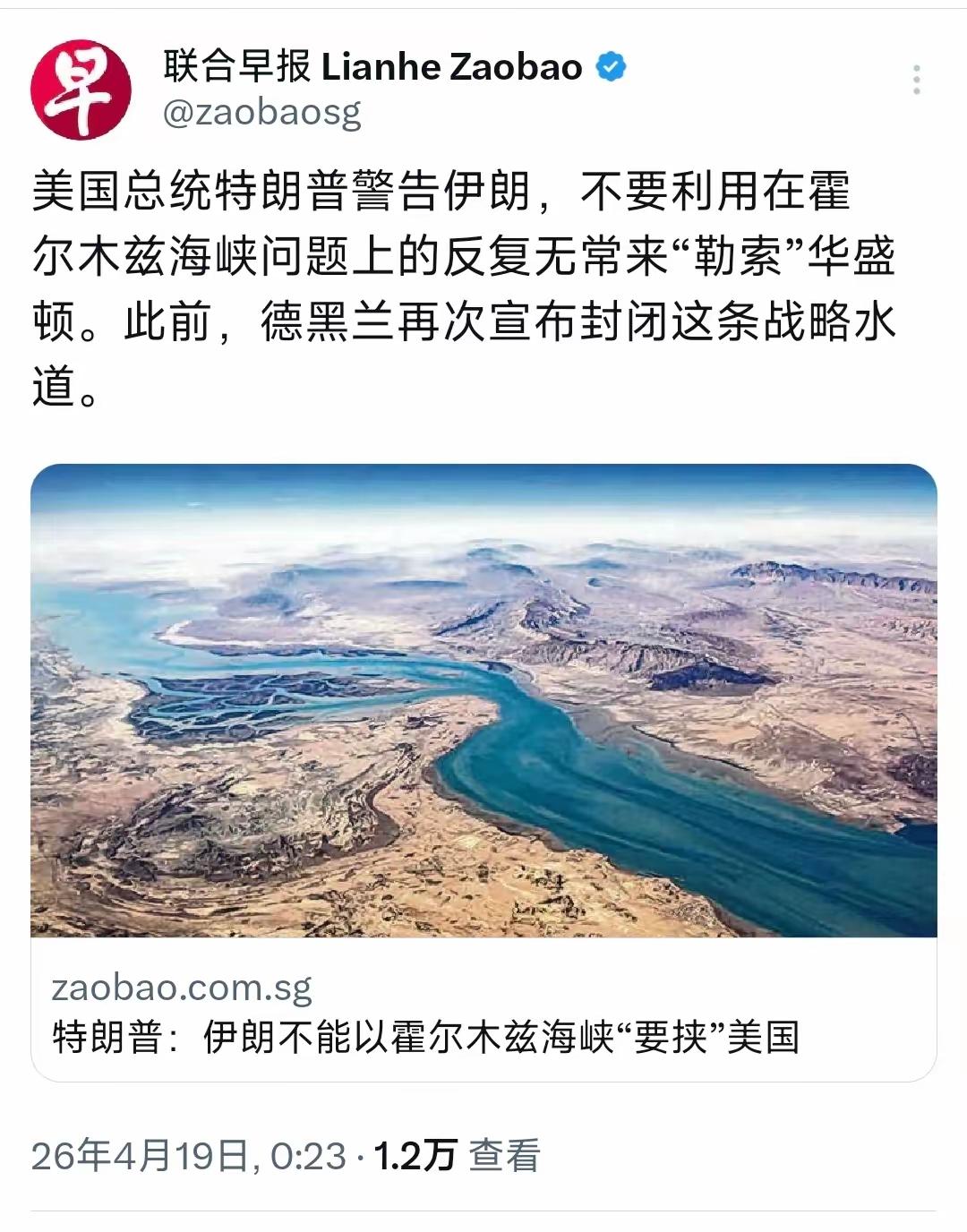 外媒今天(4月19日)报道:“美国总统特朗普警告伊朗,不要利用在霍尔木兹海峡问题上的反复无常来‘勒索’华盛顿。此前,德黑兰再次宣布封闭这条战略水道。”