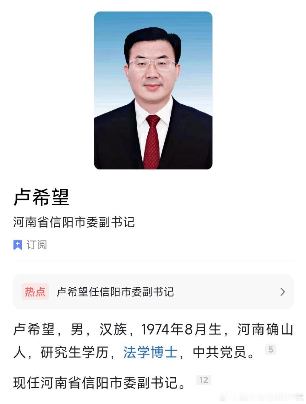 卢希望任信阳市委副书记。