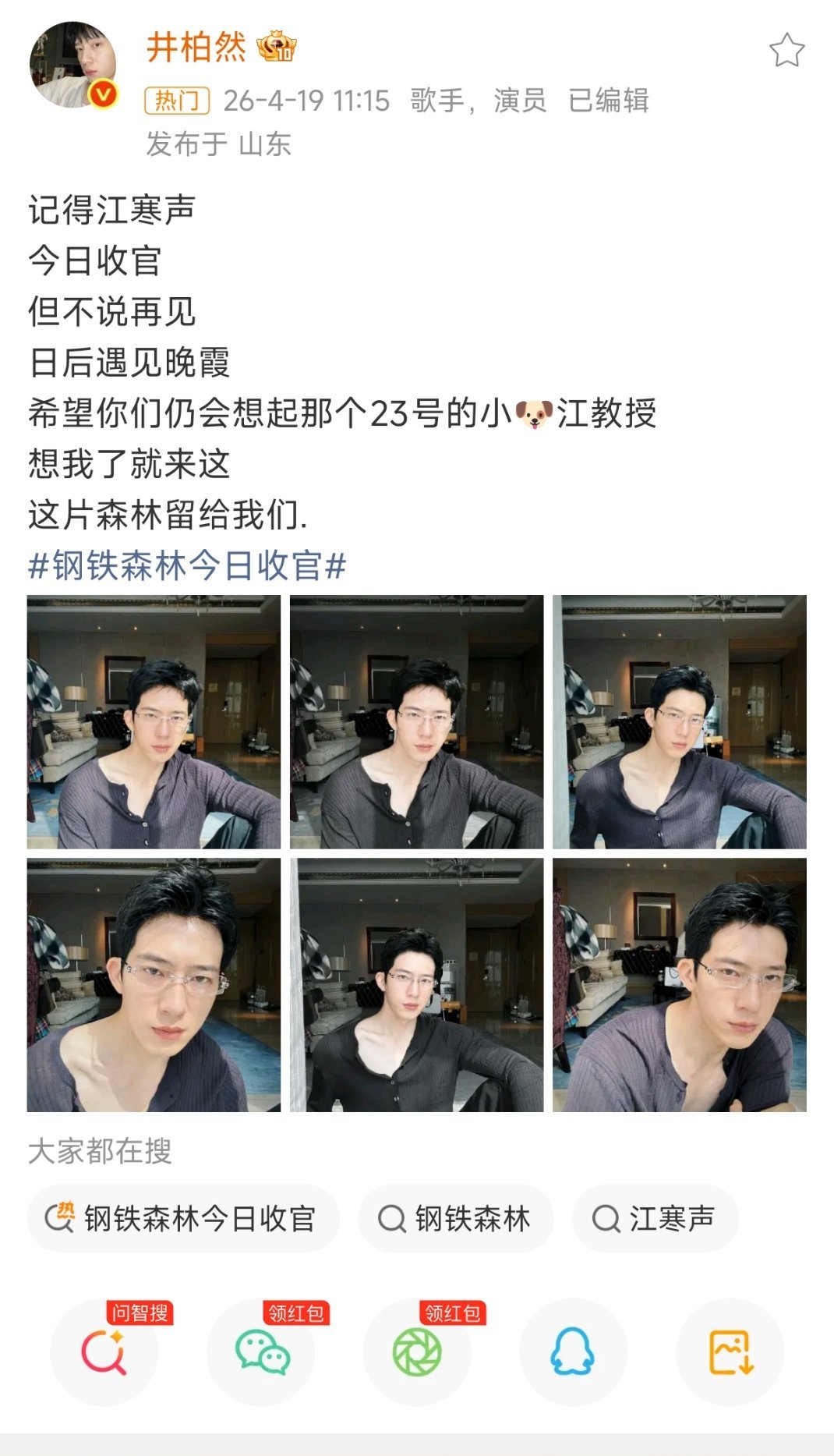 井柏然告别钢铁森林感觉真的好用心,真的对这种对自己作品有真情实感的人特别的有好感,井柏然真的认真对待自己每个角色,钢铁森林真的演的好好,两种疯狂和乖巧性格的切换真的太有魅力了。