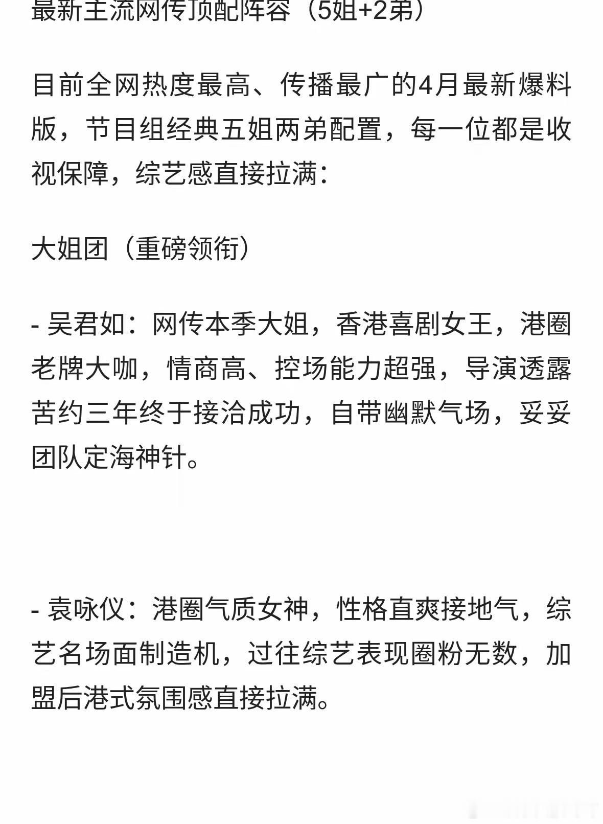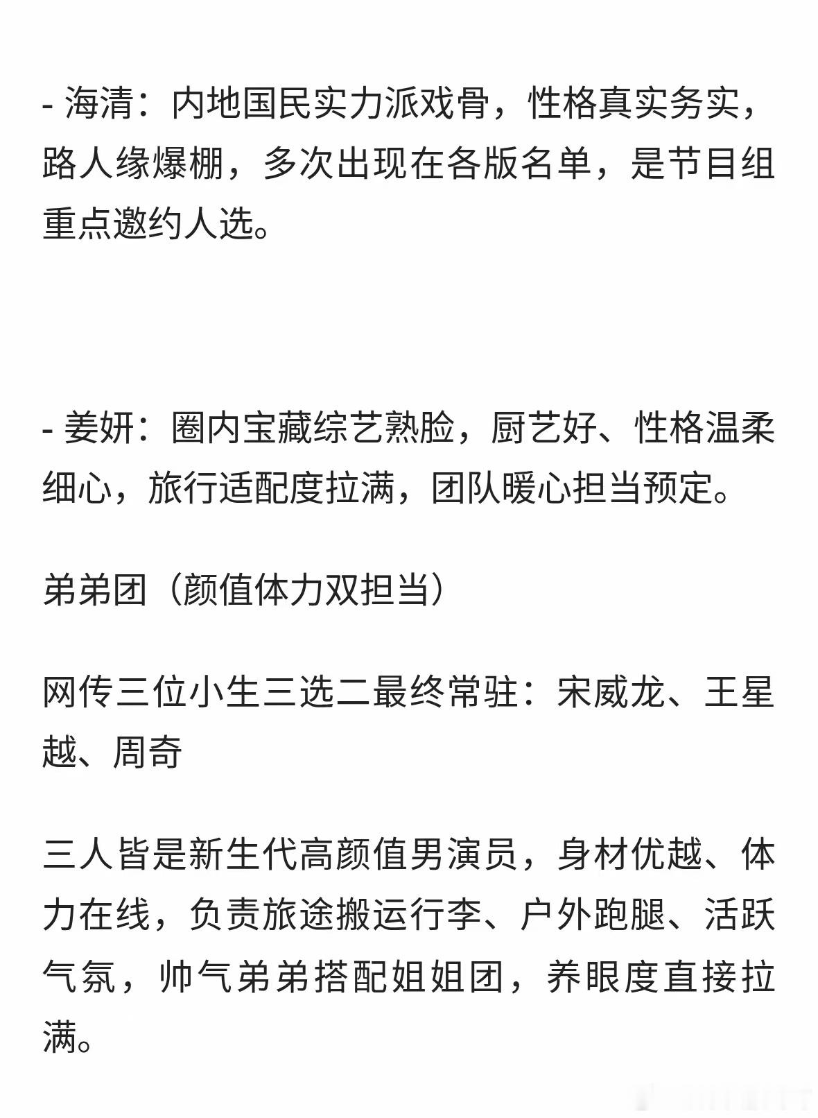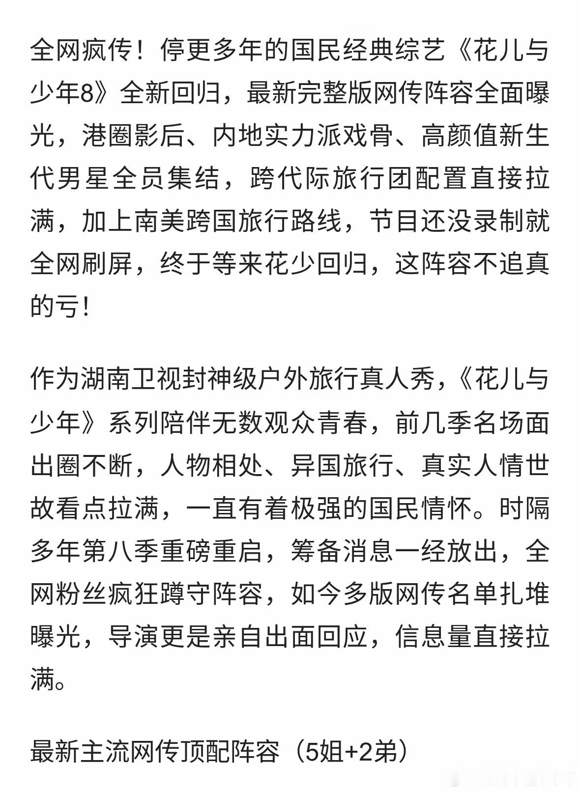 花少8 南美谁能想到《花少8》直接奔南极改闯南美三国,秘鲁、墨西哥、阿根廷一线打卡,冰川、火山、雨林奇观拉满。这趟24天真实游学之旅全程无剧本,治愈感直接封神。节目组为求真实与安全,顶着南极环保法规、10万+人均成本的压力果断转战南美,拟邀"姐姐+弟弟"阵容曝光。吴君如当大姐、闫妮带团,搭配吴磊、宋威龙等人气嘉宾,既有笑点又有颜值。