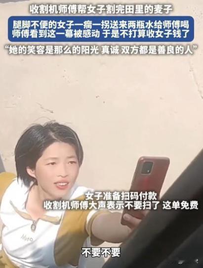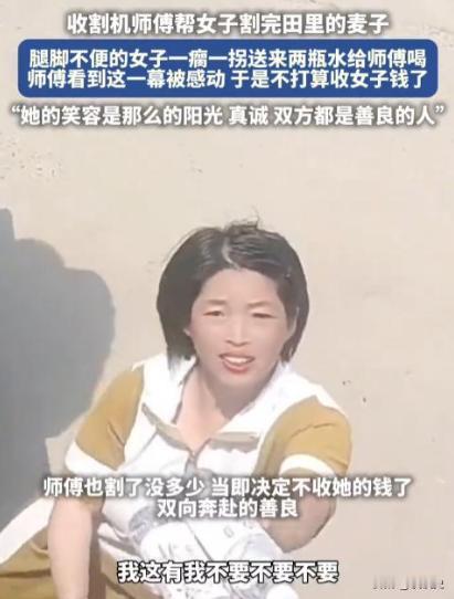 这就是最底层人民的善良!安徽宿州,一残疾女子请求收割机师傅在烈日下帮忙收麦子,并热情的为其送上两瓶矿泉水,收割机师傅感动不已,直接为女子免单收割费,以表谢意。这温馨的双向奔赴,瞬间引起了网友们的赞扬。