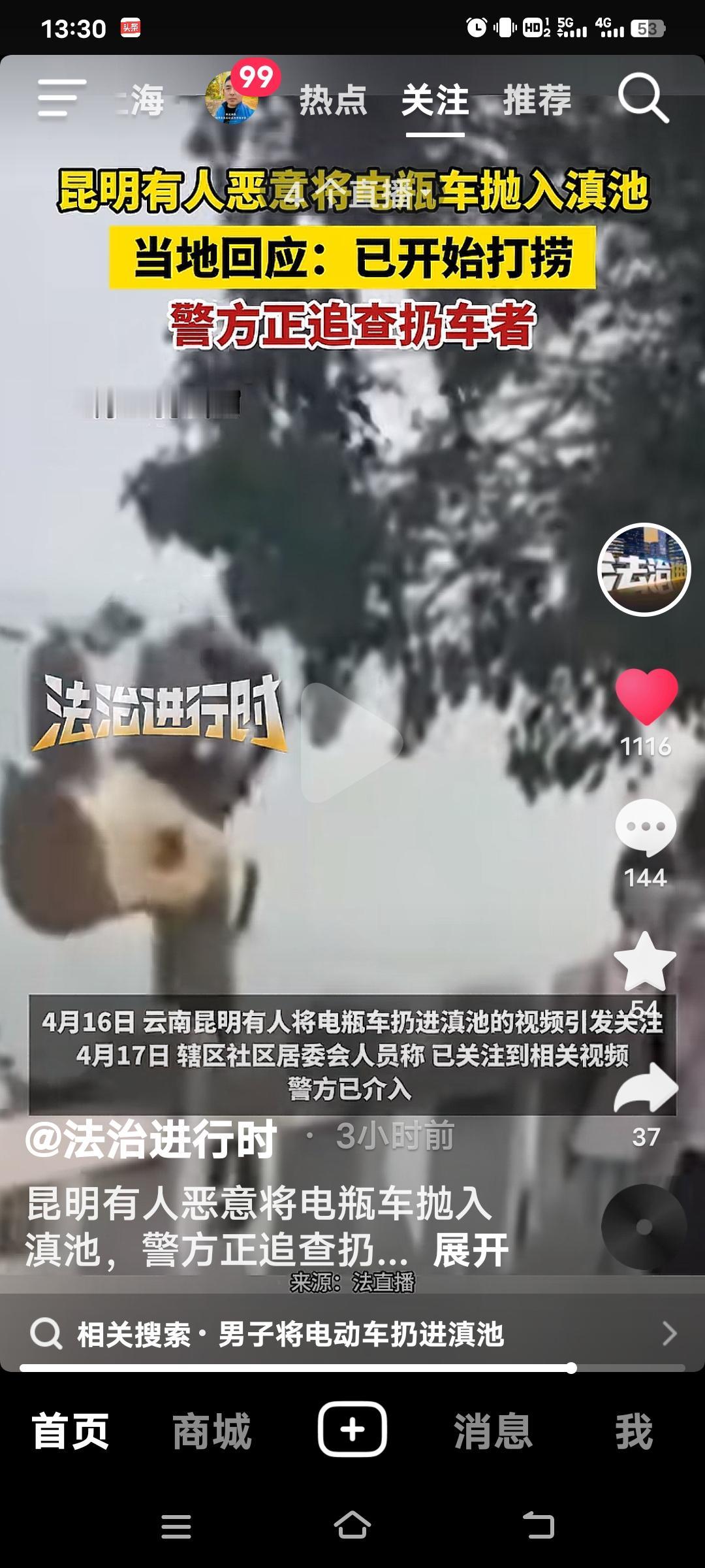 这辆电瓶车是租赁公司提供的公共设施,价值约5800元,还配备了48V锂电池。男子的这一行为,不仅损毁了公共财物,还对滇池生态造成破坏,完全无视昆明人守护母亲湖所付出的心血。目前,警方正在追查扔车者,一定要让他们为自己的所作所为付出代价!