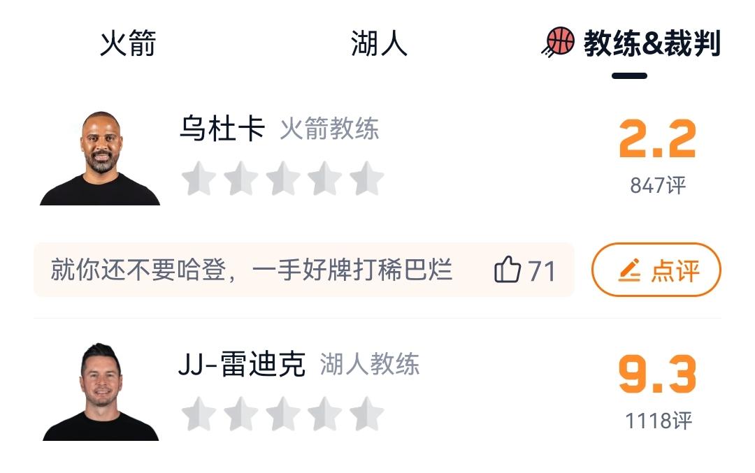 火箭客场输湖人,主教练乌杜卡被千夫所指,球迷只给到他2.2分,并且呼吁他立马下课。