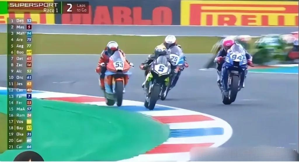 当时53号德比斯明明已经杀到了第一。眼瞅着冠军就在眼前了,结果5号杜卡迪直接来了个晚刹车,强行切内线把路线给死死焊住。