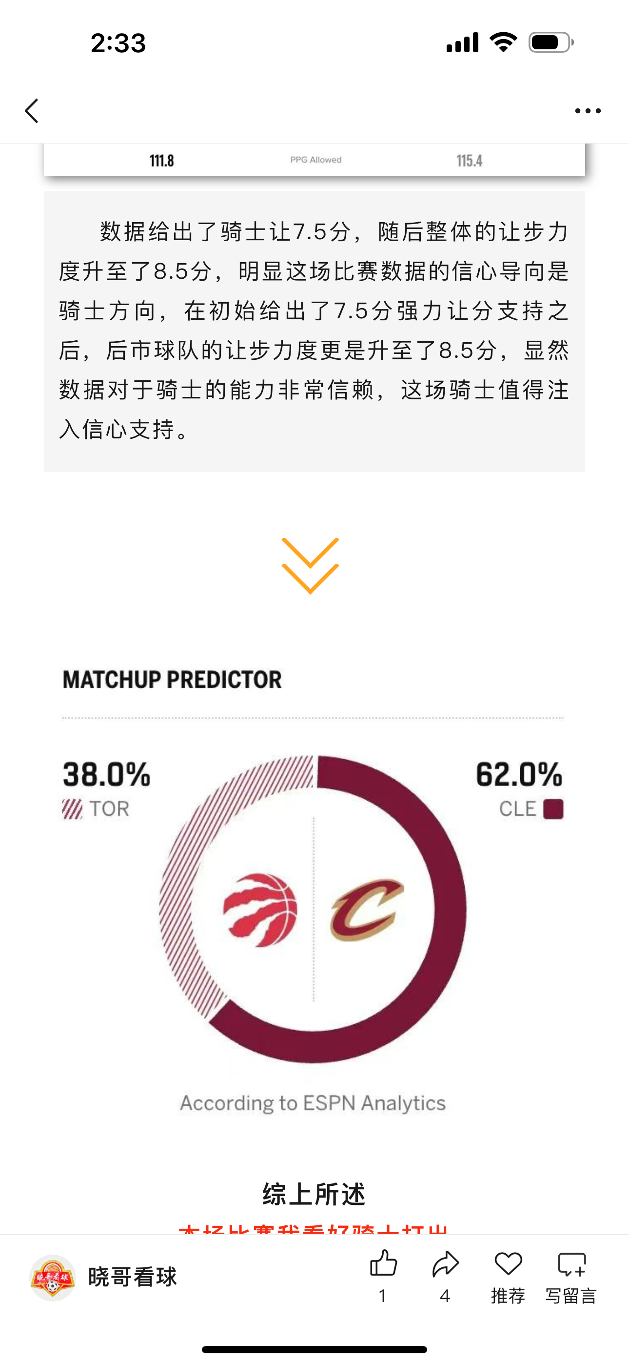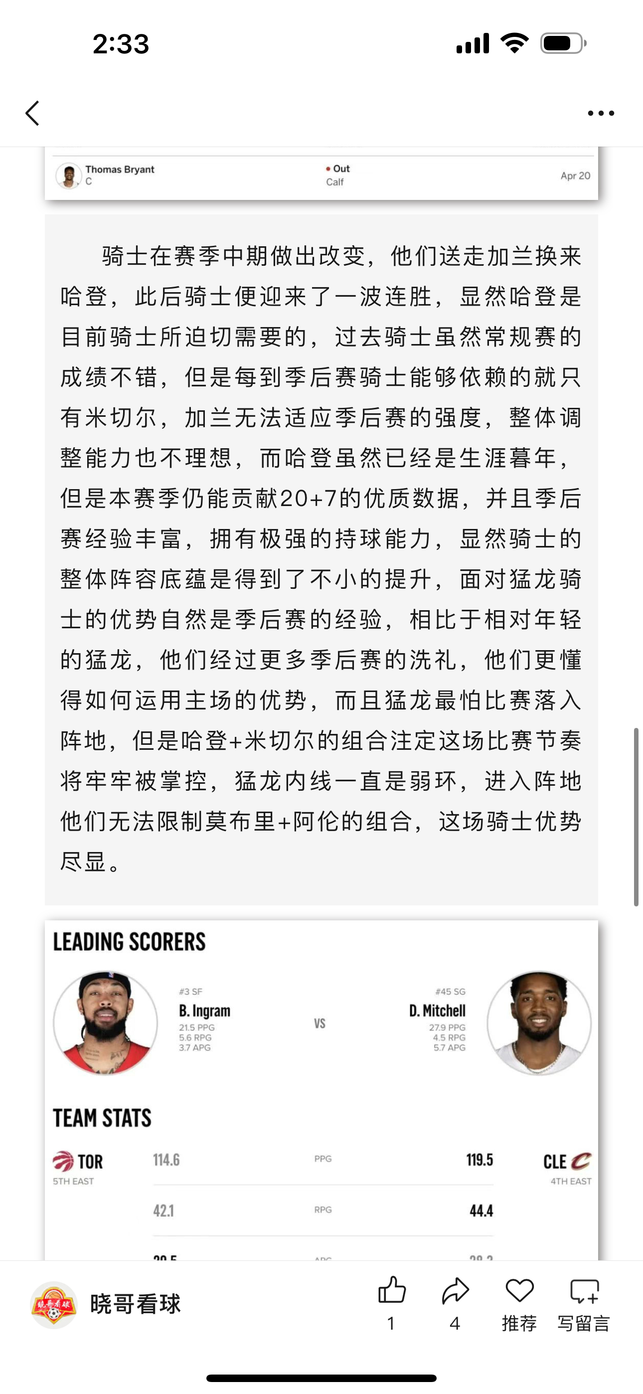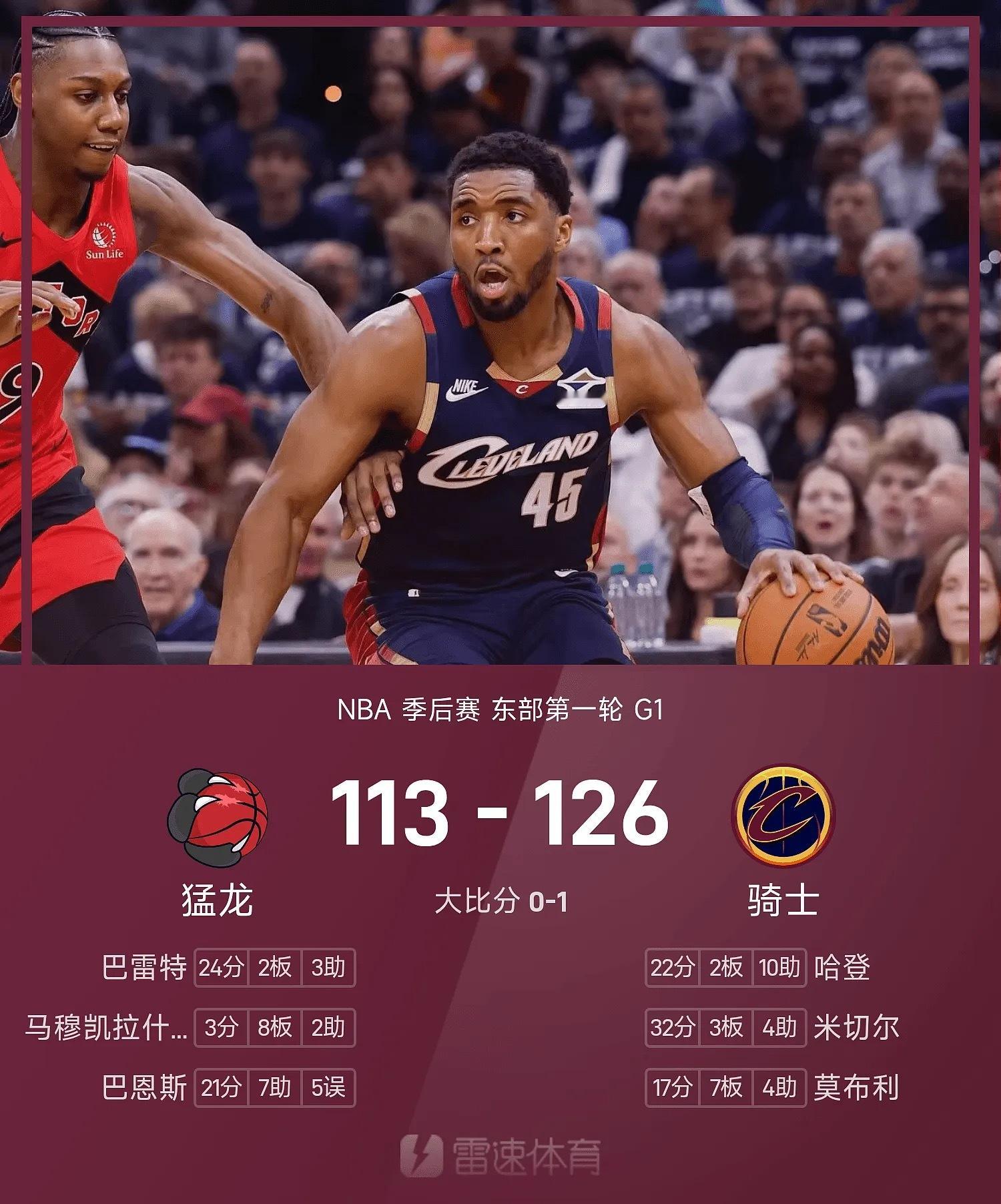 昨日公推NBA季后赛骑士方向收获好评成绩,首节骑士便轰出36:22的冲击波,显然骑士做了充足的准备,而猛龙无法限制住米切尔的高效发挥,全场米切尔砍下32分,有哈登的存在他可以专注于得分,而哈登22+10的数据完美控场,我在析文中就提到交易哈登对于骑士来说可以说是一次质变,而且骑士护框能力出色,猛龙锋线没有发挥空间,全场仅巴雷特砍下24分,剩余核心都没得分破20,这场好评合理!NBA骑士vs猛龙体彩篮球预测体育赛事