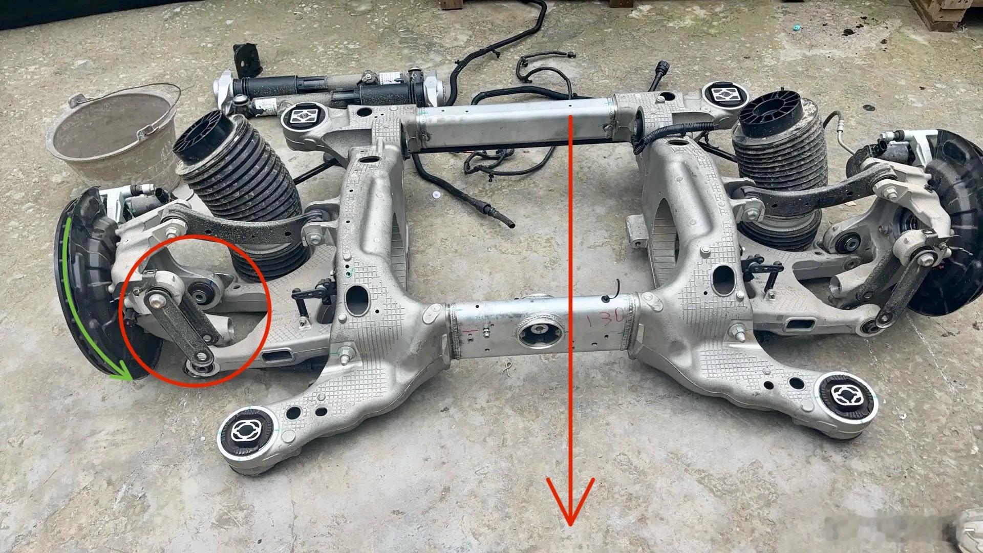 长安系h臂悬架的integral link(图中红圈)从H臂向上连接羊角,且位于轴前,因此制动时集成连杆受压力。