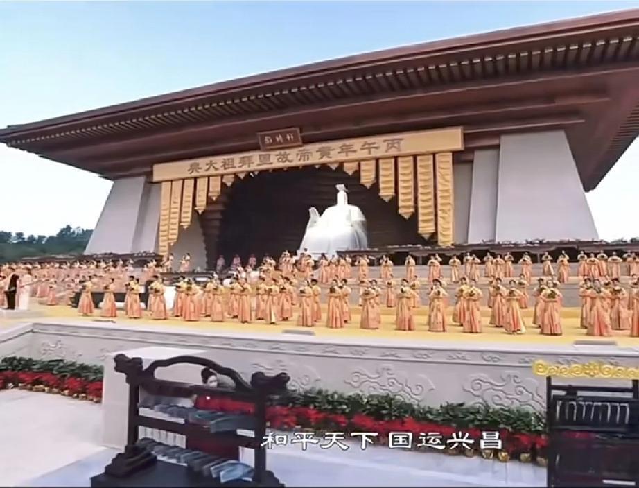 她穿了红色的有印花的中式长裙子,一边唱《黄帝颂》,一边有动作配合,看着波澜壮阔。