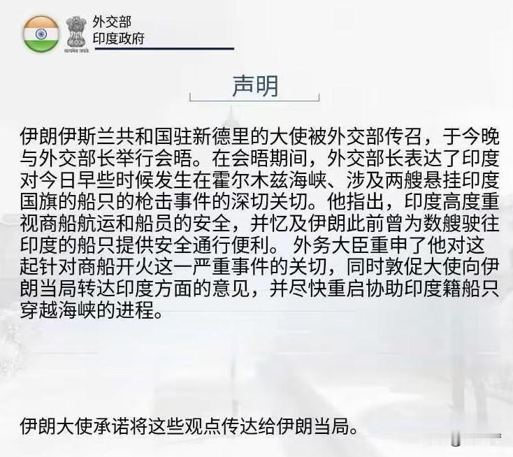 尽管印度通过外交照会,表达了对伊朗炮击两艘过往霍尔木兹海峡印度商船的不满,但印度还是非常克制。
