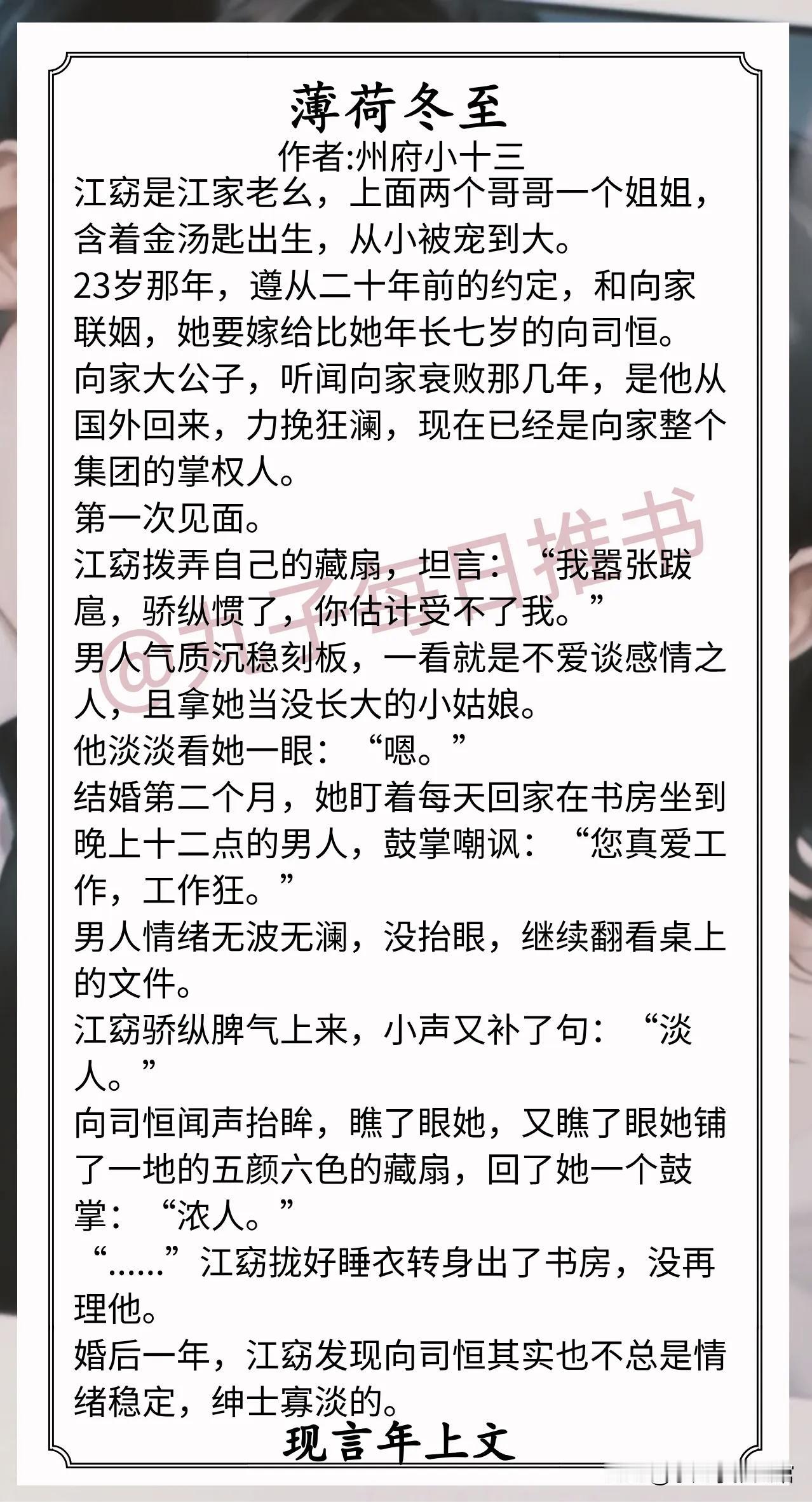 7.《薄荷冬至》作者:州府小十三(小妖精vs正经男,豪门联姻,古板男动心,慢热日常流,年上7)