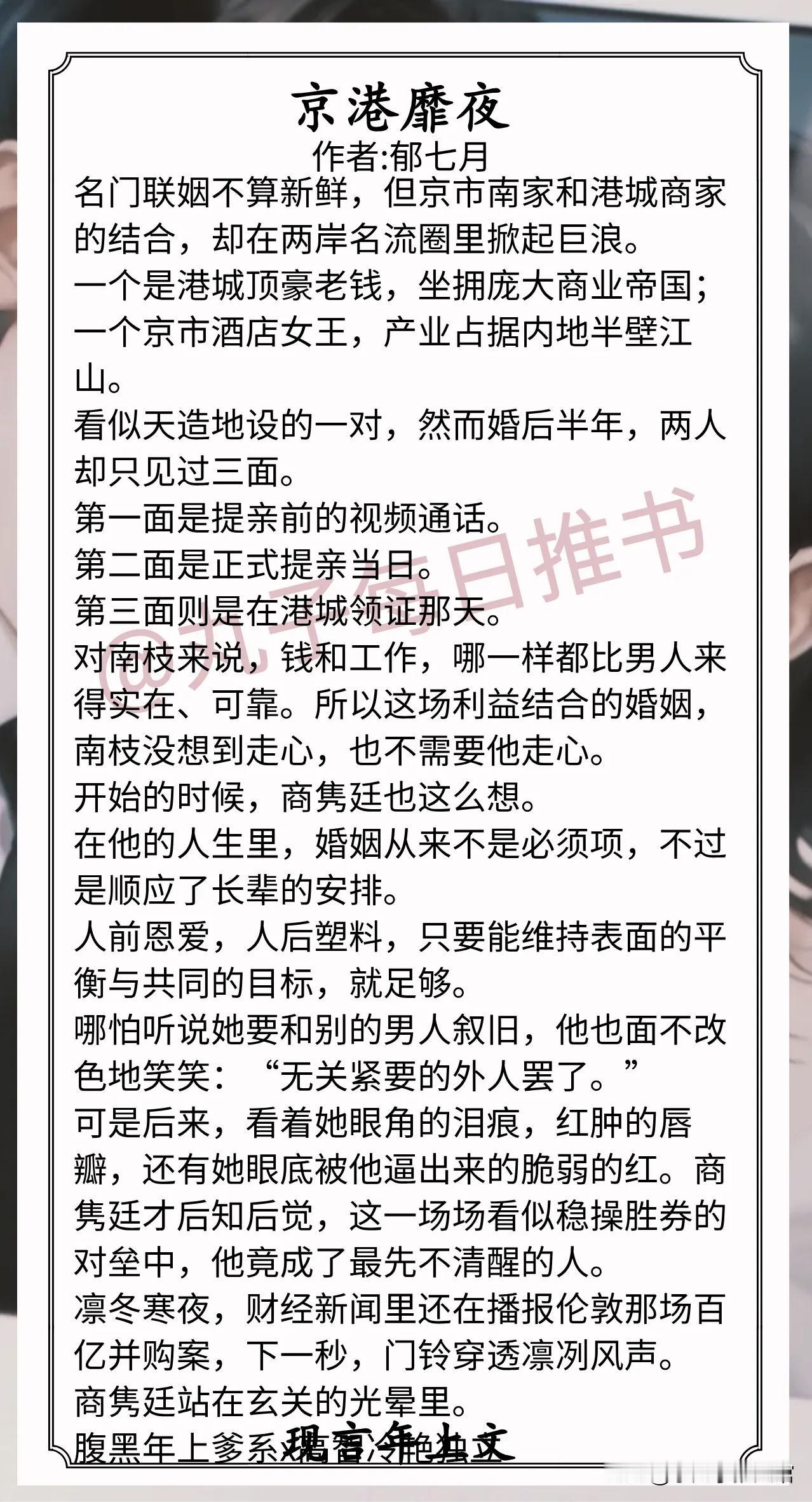 6.《京港靡夜》作者:郁七月(高智冷艳独立vs腹黑年上爹系,先婚后爱,男主先动心)