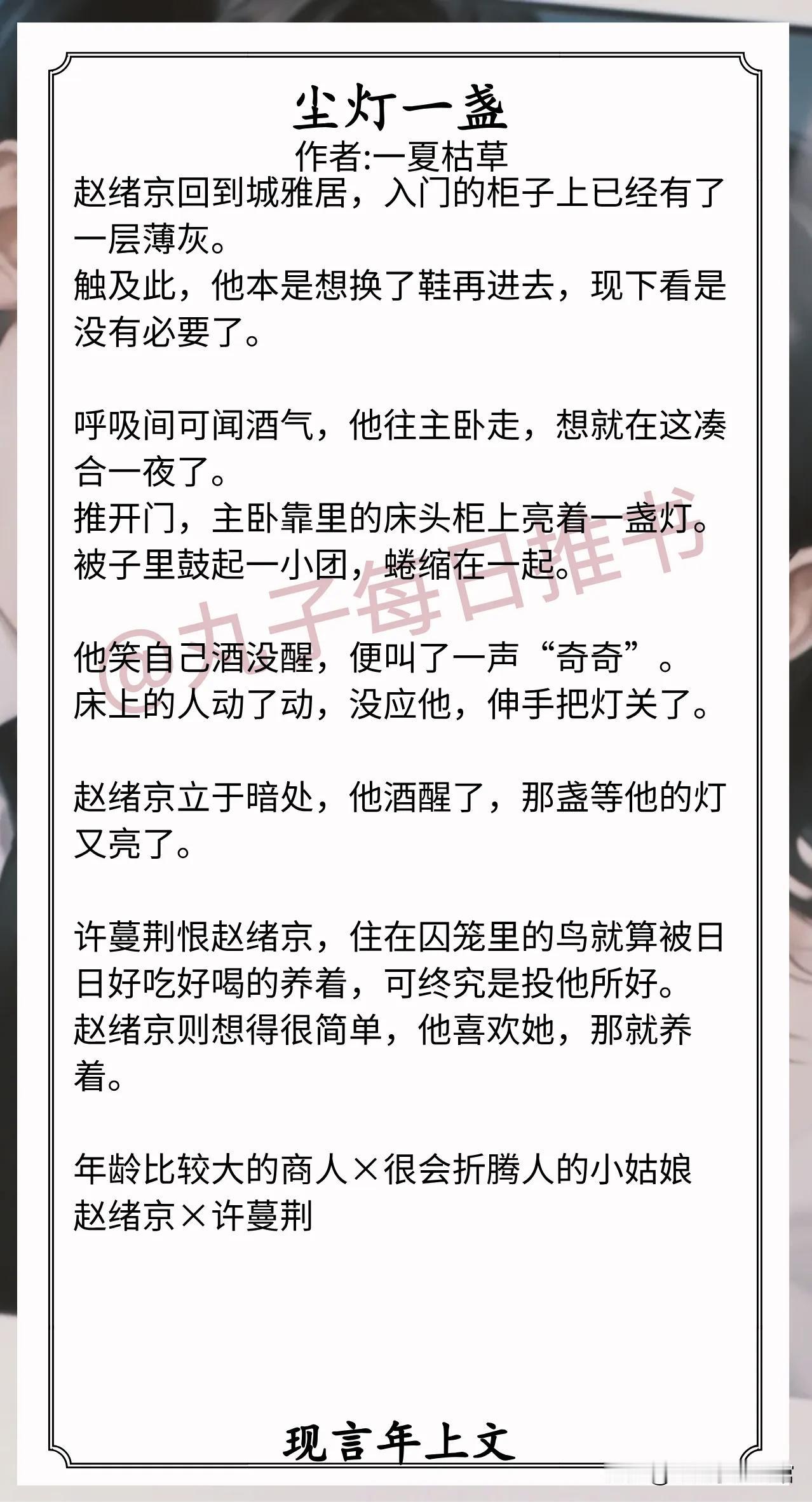 9.《尘灯一盏》作者:一夏枯草(22岁勇敢小姑娘vs33岁腹黑成熟商人,男套路女,先婚后爱,年上)小说 推文