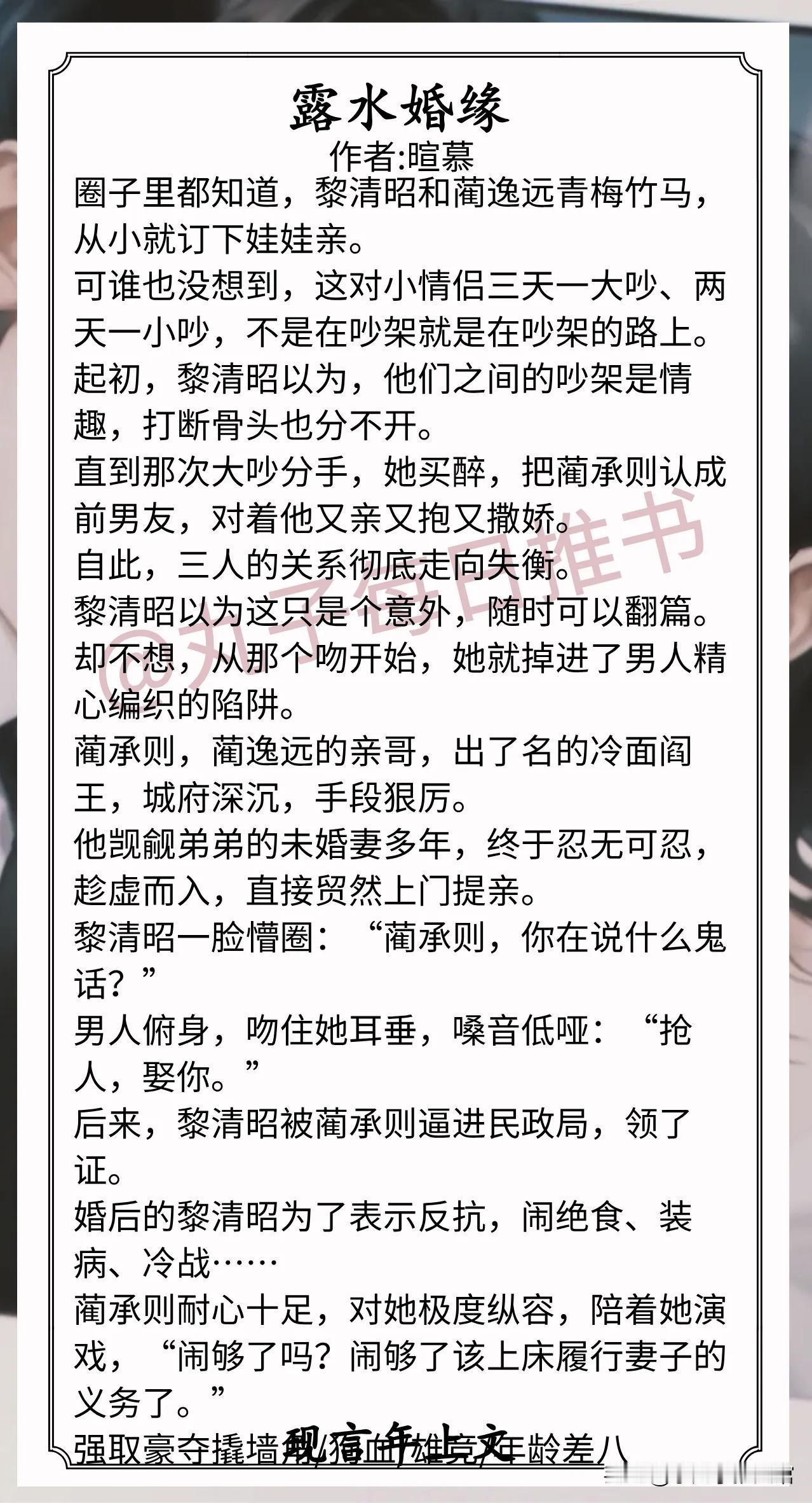 2.《露水婚缘》作者:暄慕(娇纵又怂包的小作精vs腹黑霸道年上daddy,撬墙角,强取豪夺,年龄差)