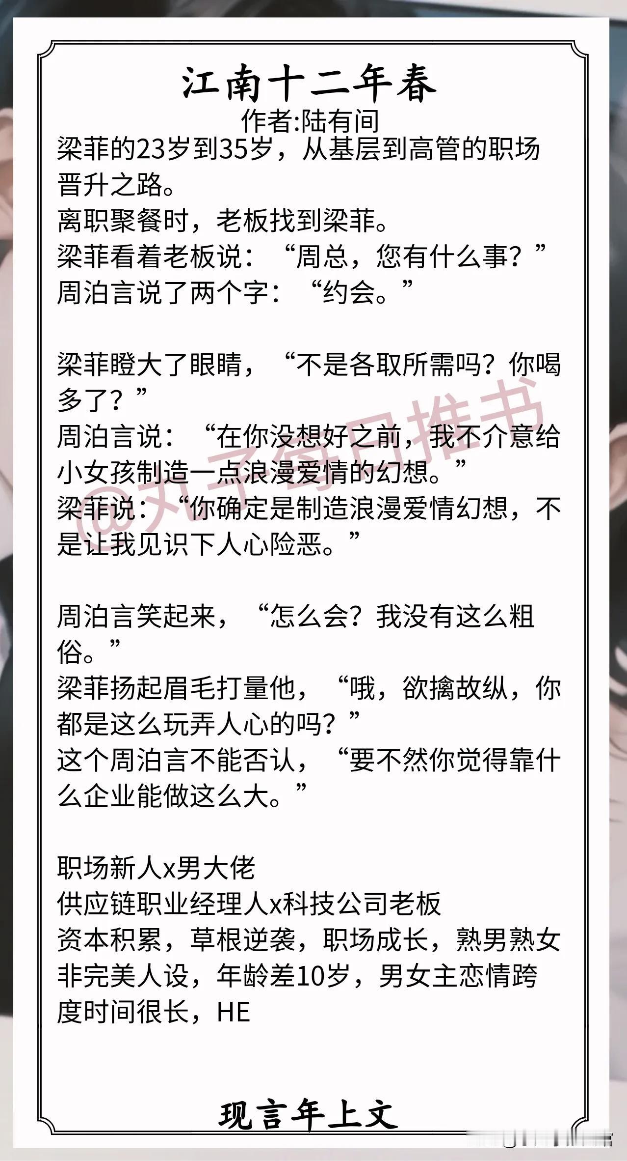 5.《江南十二年春》作者:陆有间(供应链职业经理人vs科技公司老板,职场成长,熟男熟女,年龄差10岁)
