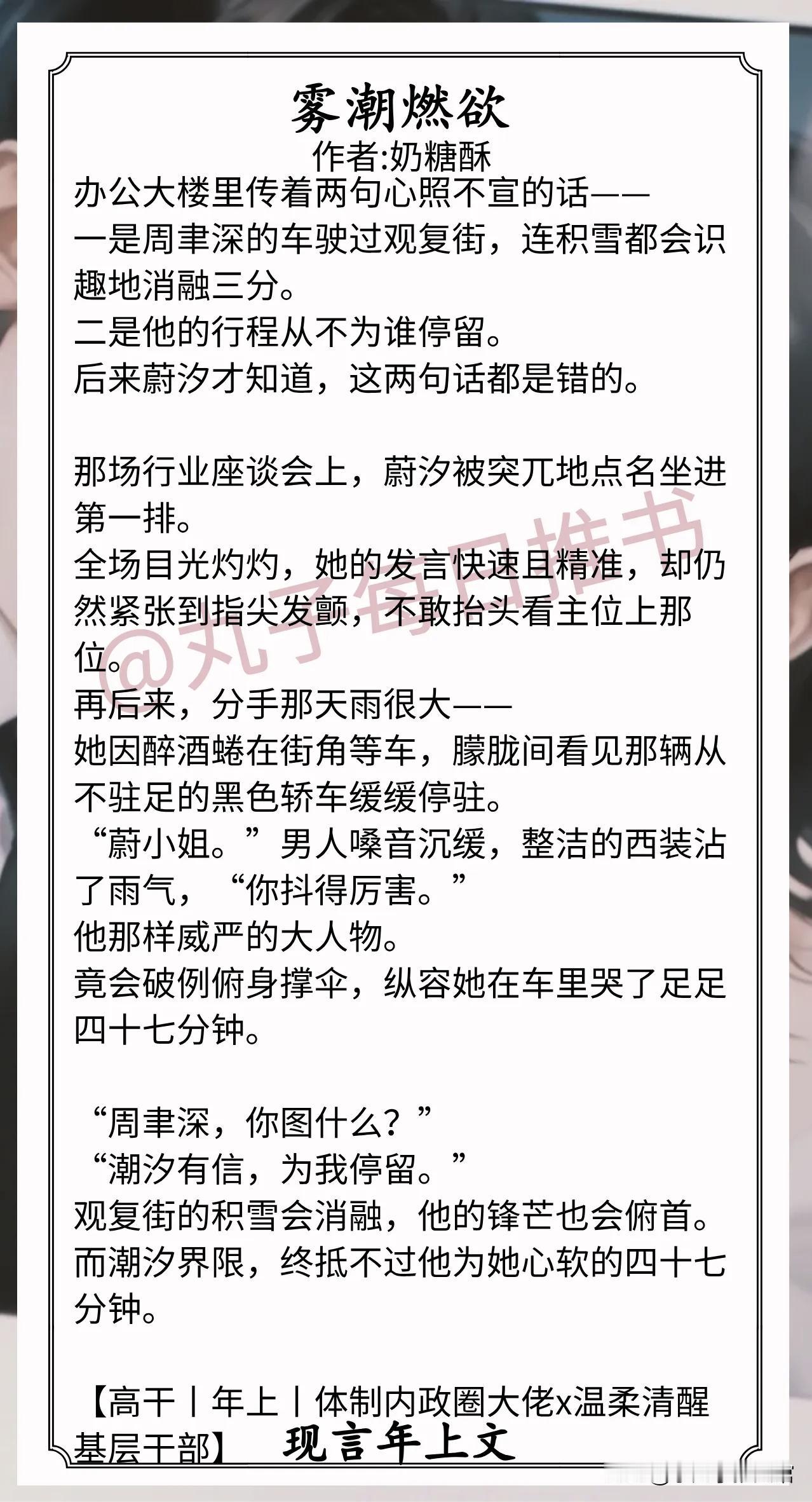 8.《雾潮燃欲》作者:奶糖酥(基层干部女vs政圈老干部,上位者低头,机关高干文,年上)