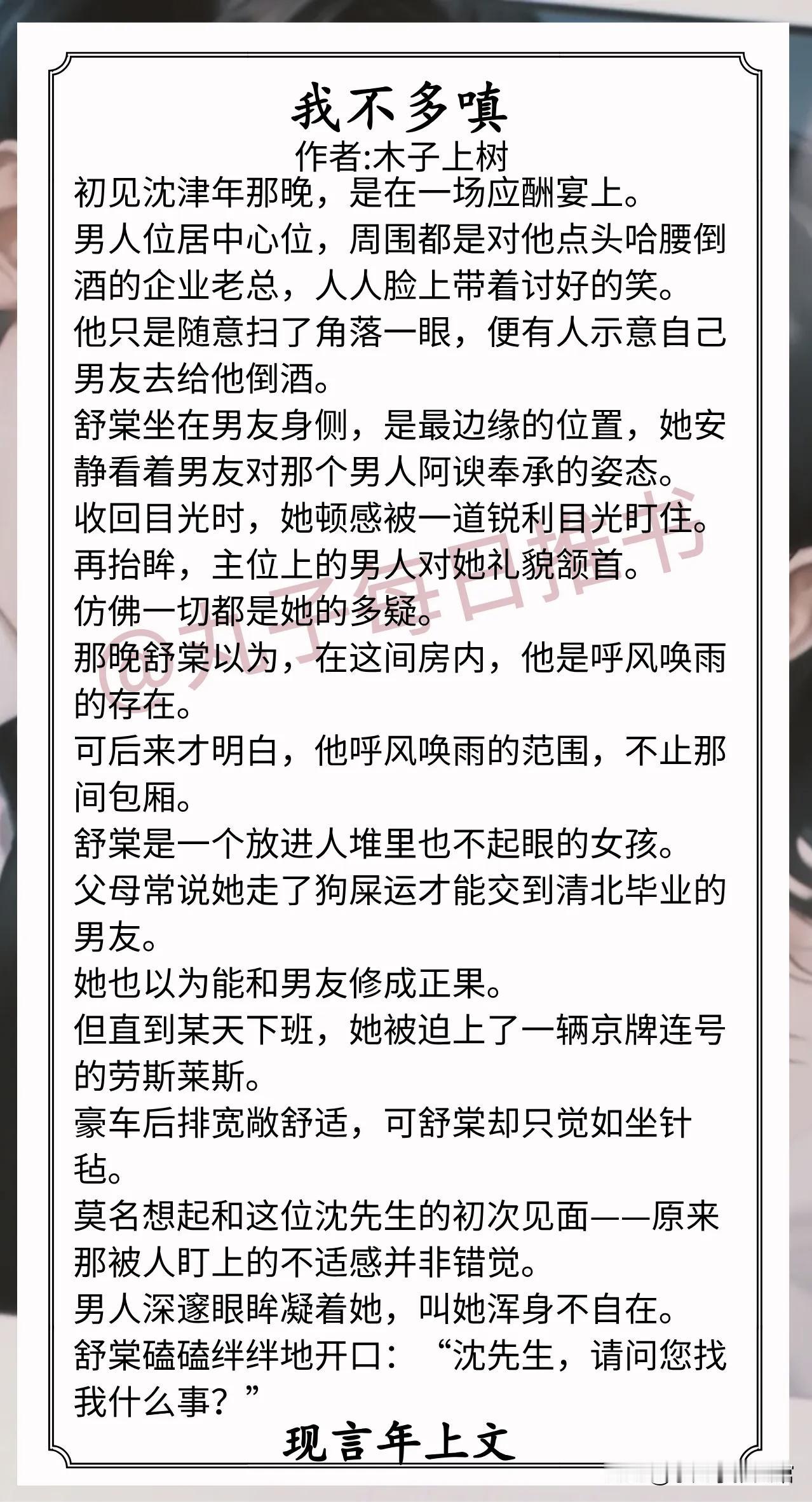 3.《我不多嗔》作者:木子上树(坚韧小白花vs位高权重疯批年上,强取豪夺,撬墙角,年龄差8)