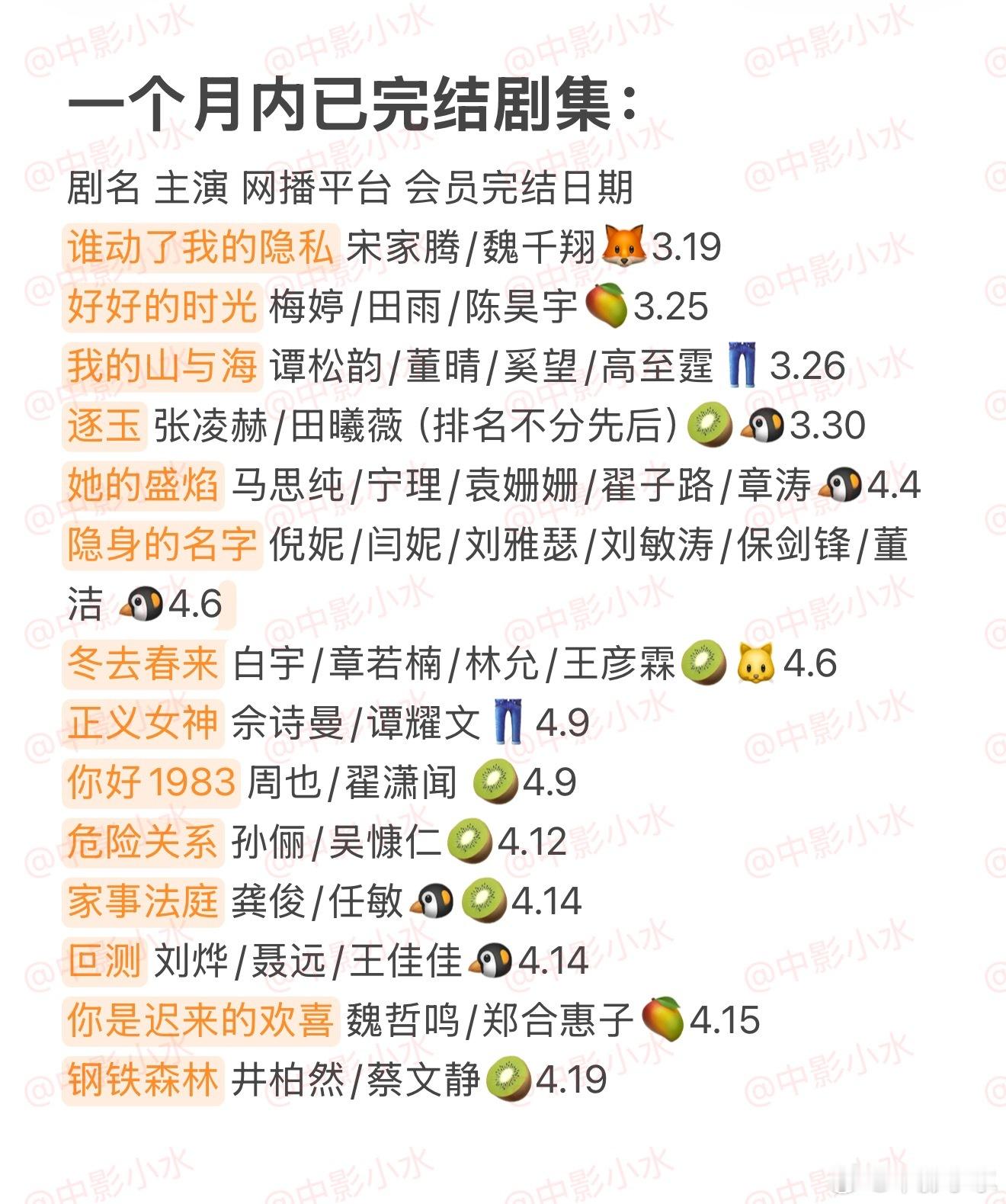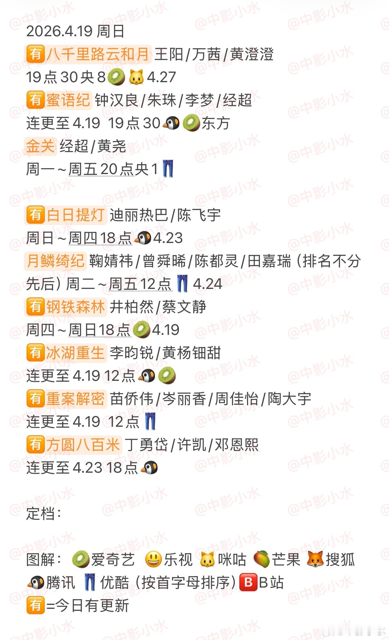 拯救剧荒 4月19日,今晚看点啥??图1 追剧日历 图2 综艺日历 图3 已完结剧集 🈶八千里路云和月 王阳/万茜/黄澄澄🈶蜜语纪 钟汉良/朱珠/李梦/经超