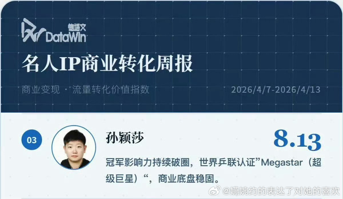 孙颖莎登德塔文商业榜第三国际乒联认证的唯一超级巨星就这样水灵灵的出现