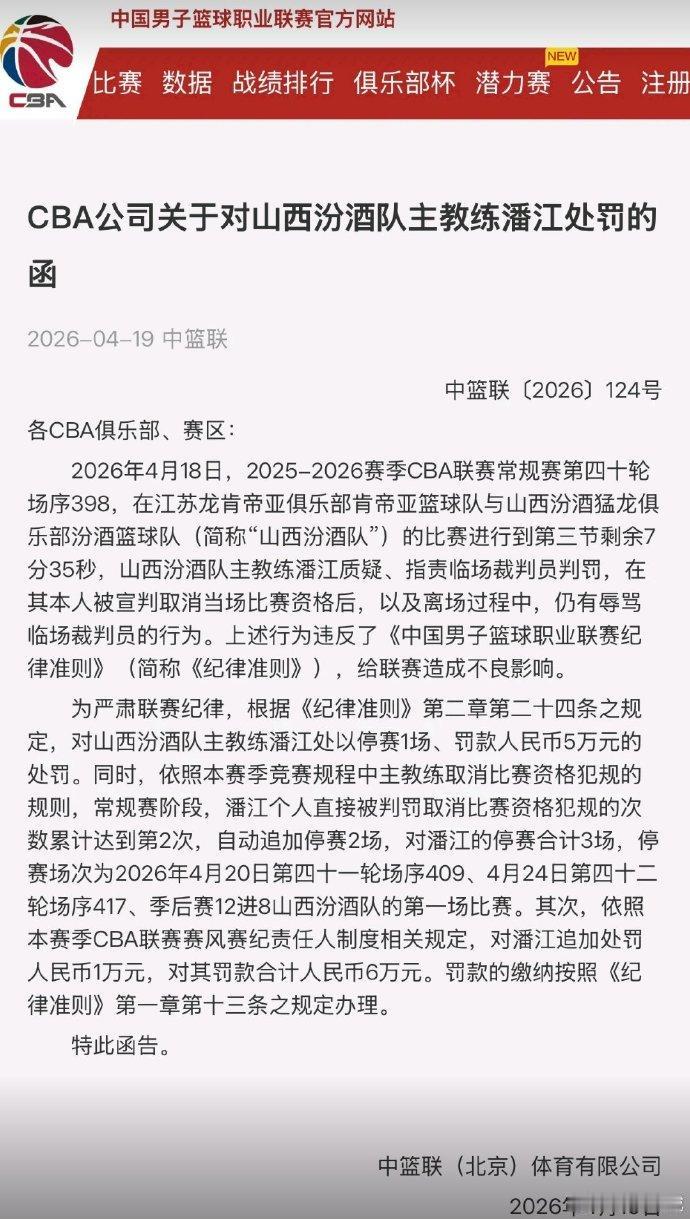 山西队主教练潘江真是老实人被欺负啊!因表达对裁判的不满被停赛三场,还被罚款6万元
