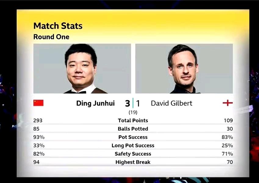 丁俊晖对阵土豆哥的前四局,丁主任3-1暂时领先吉尔伯特。看得出丁主任这段时间练了