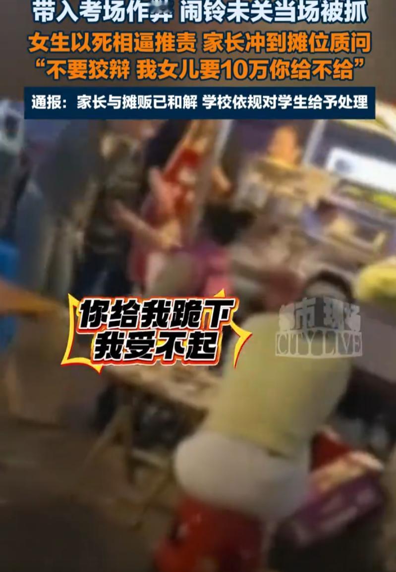 重庆,一高三女儿跟校外的麻辣烫阿姨借手机作弊,结果被监考老师发现后,竟以死逼妈“摆平”?家长来到摊前让麻辣烫阿姨负责,无奈之下,阿姨选择下跪,家长却说:这一跪我受不起!