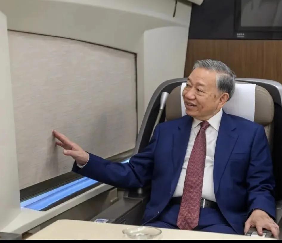 越南领导人苏林,坐在我们的动车上,一脸欣赏的看着动车。