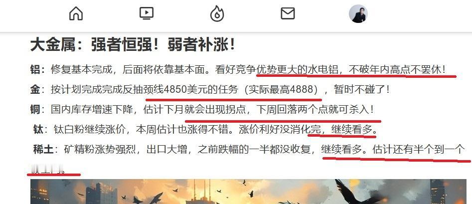 【金属板块:谁将加快上涨?】前几周领衔的铝在本周依然强,之前较弱的铜也果然补涨,黄金按计划突破4950美元。稀土也带着各种小金属继续涨!由于战争结束的趋势确定,而本周无论是强者的继续强,还是弱者的补涨幅度都还算温和,因此这个趋势有望继续维持。