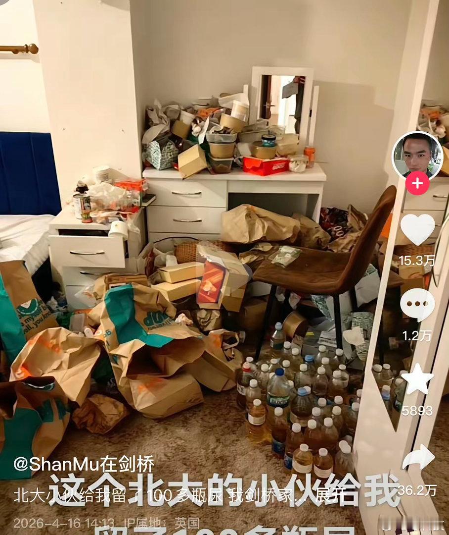 那个北大的交换生真把人看懵了!英国房东好心短租给他,没签合同也没收押金,结果这哥们儿退房时留下一屋子垃圾,最离谱的是墙角和床底下,居然整整齐齐码了一百多瓶用饮料瓶装的自产“陈酿”,味儿那叫一个冲!房东一开始还挺克制,发视频只想要回两千来块的清理费和赔偿。事情闹大后,这位高材生总算露面,说愿意赔钱了。所以哪怕短租还是要签合同更保险点