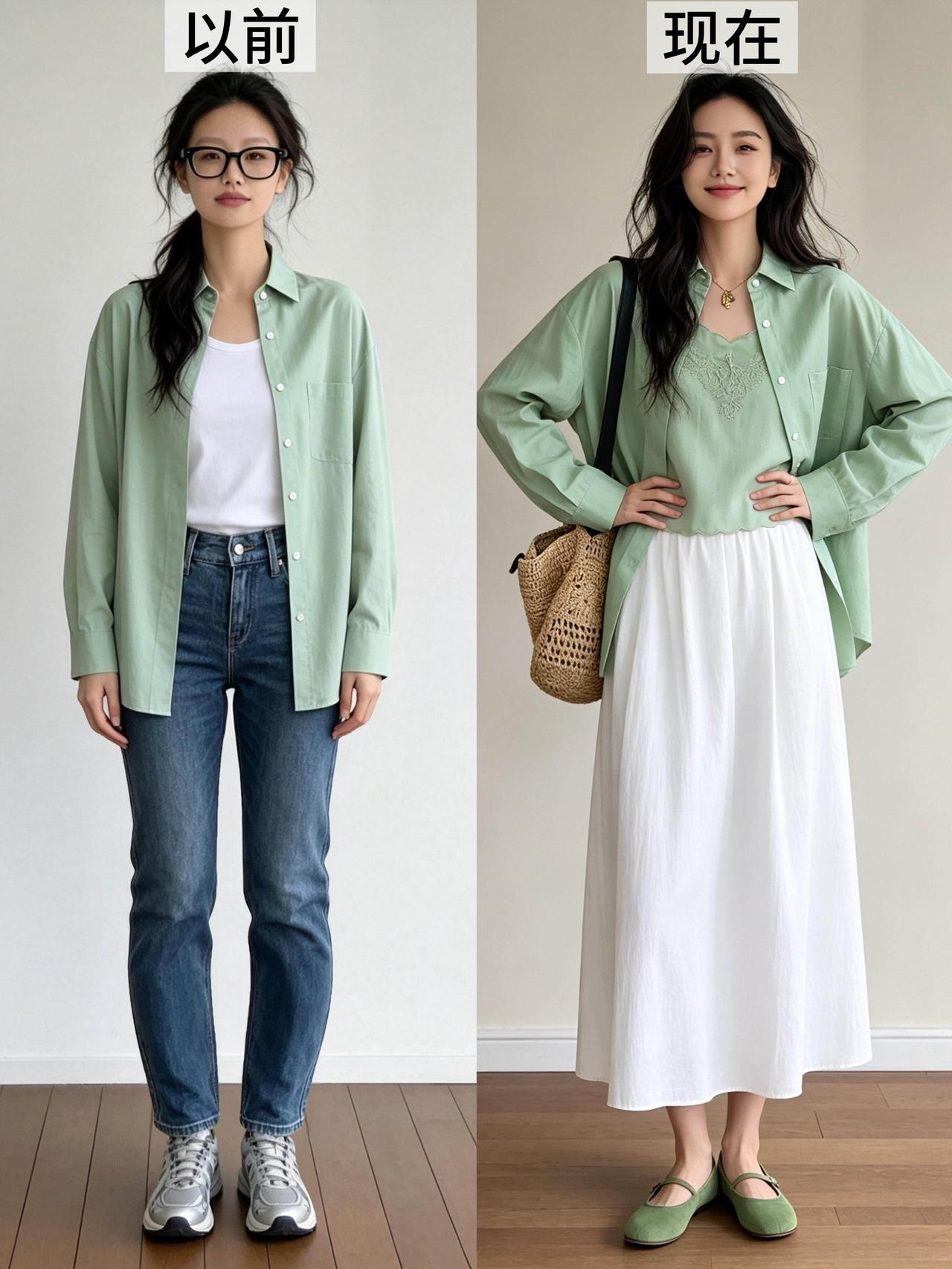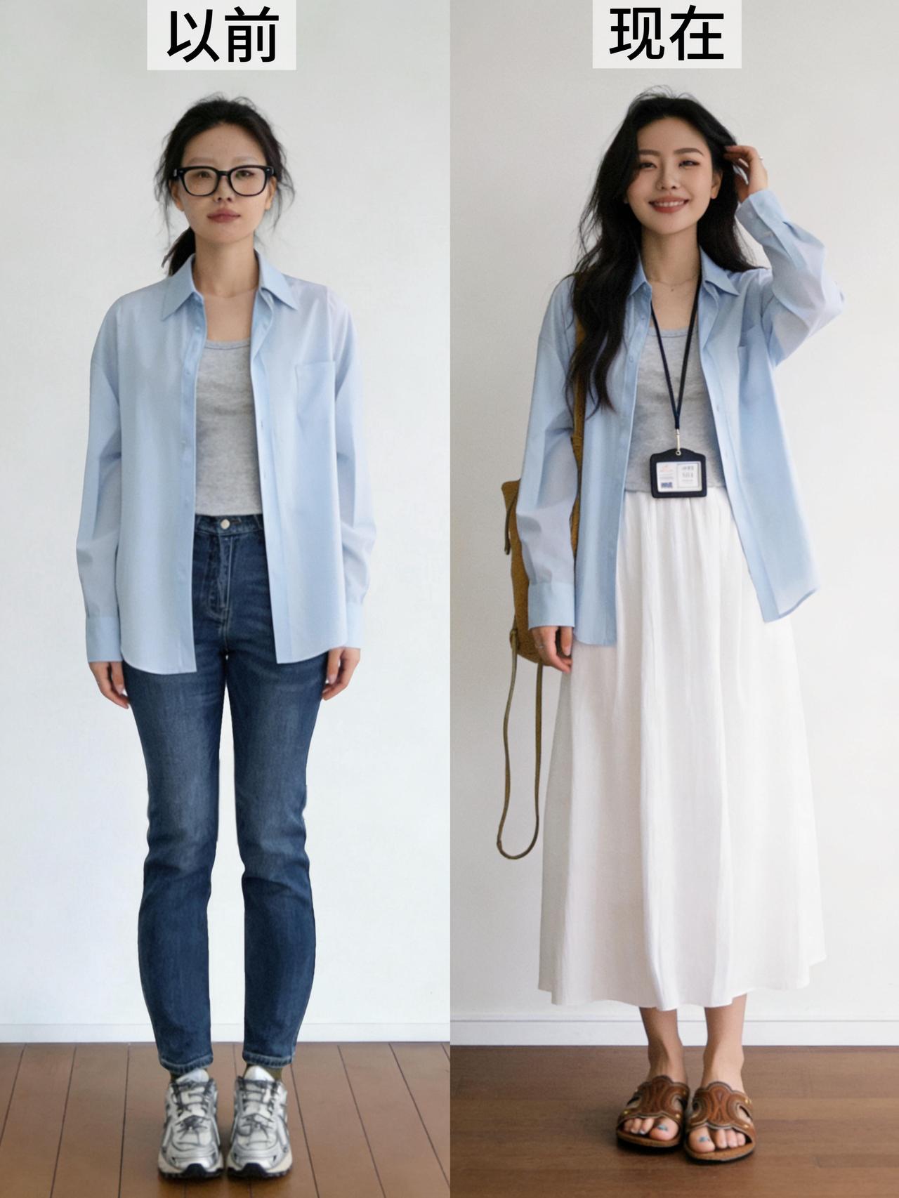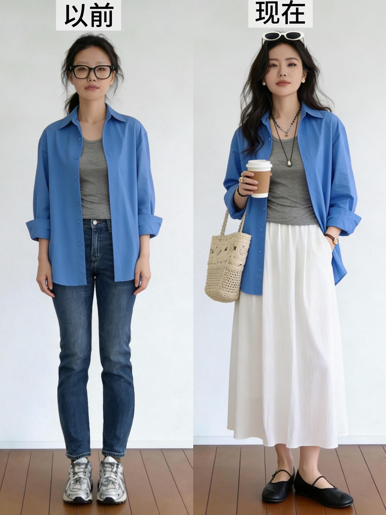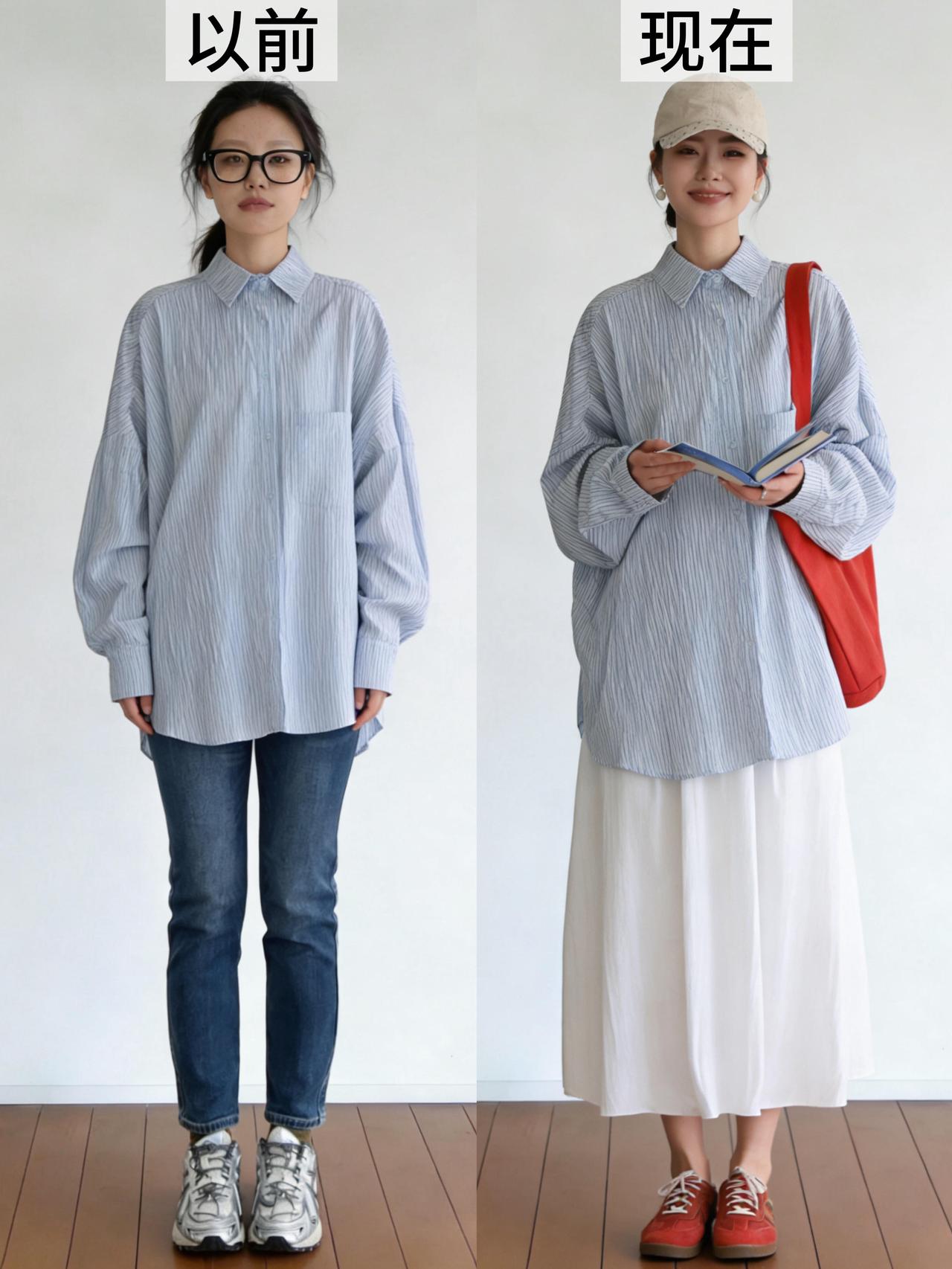 同一件衬衫,搭牛仔裤+运动鞋略显普通,换了思路:用白半裙、黑微喇裤或阔腿裤替代直筒牛仔,搭配玛丽珍鞋、凉鞋或夹脚拖,再用棒球帽、草编包、项链做点缀,瞬间就摆脱了路人感。简单调整下搭配思路,把衬衫穿成开衫、叠穿内