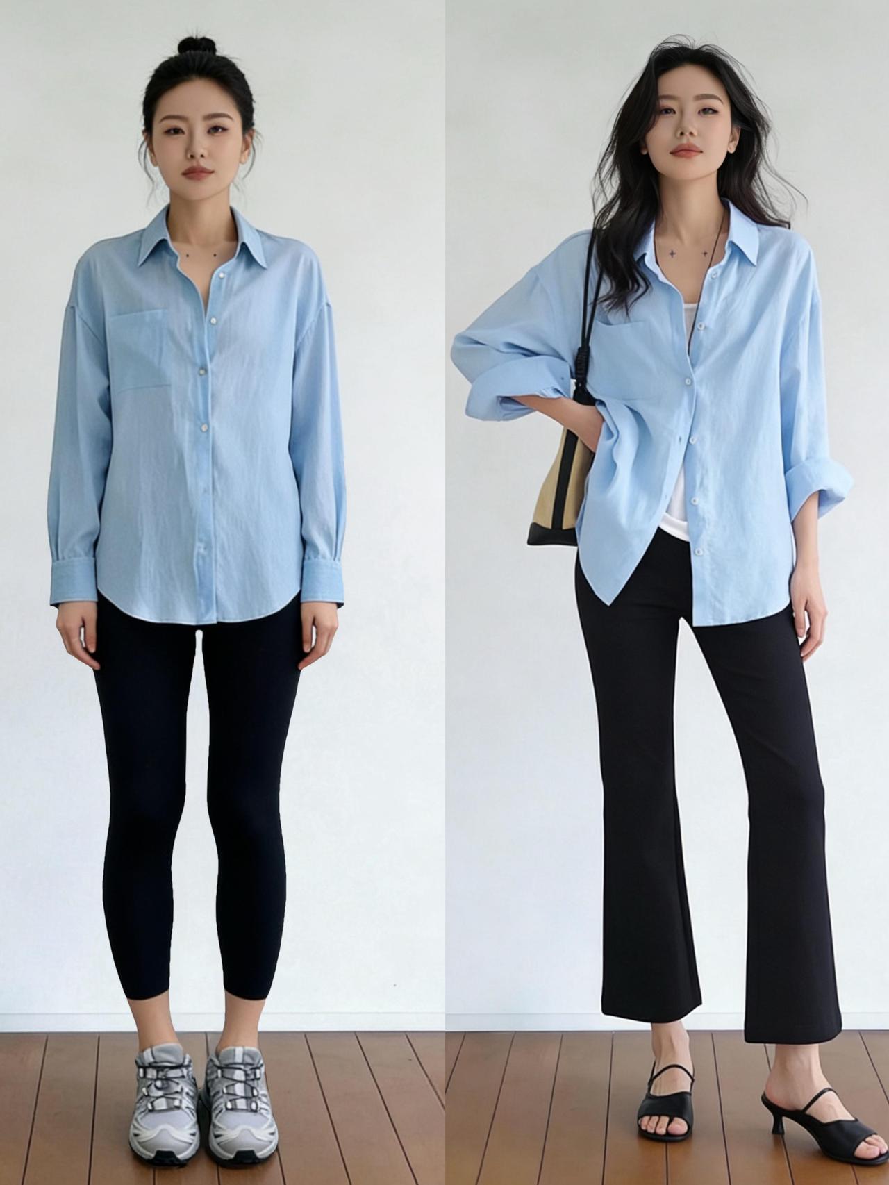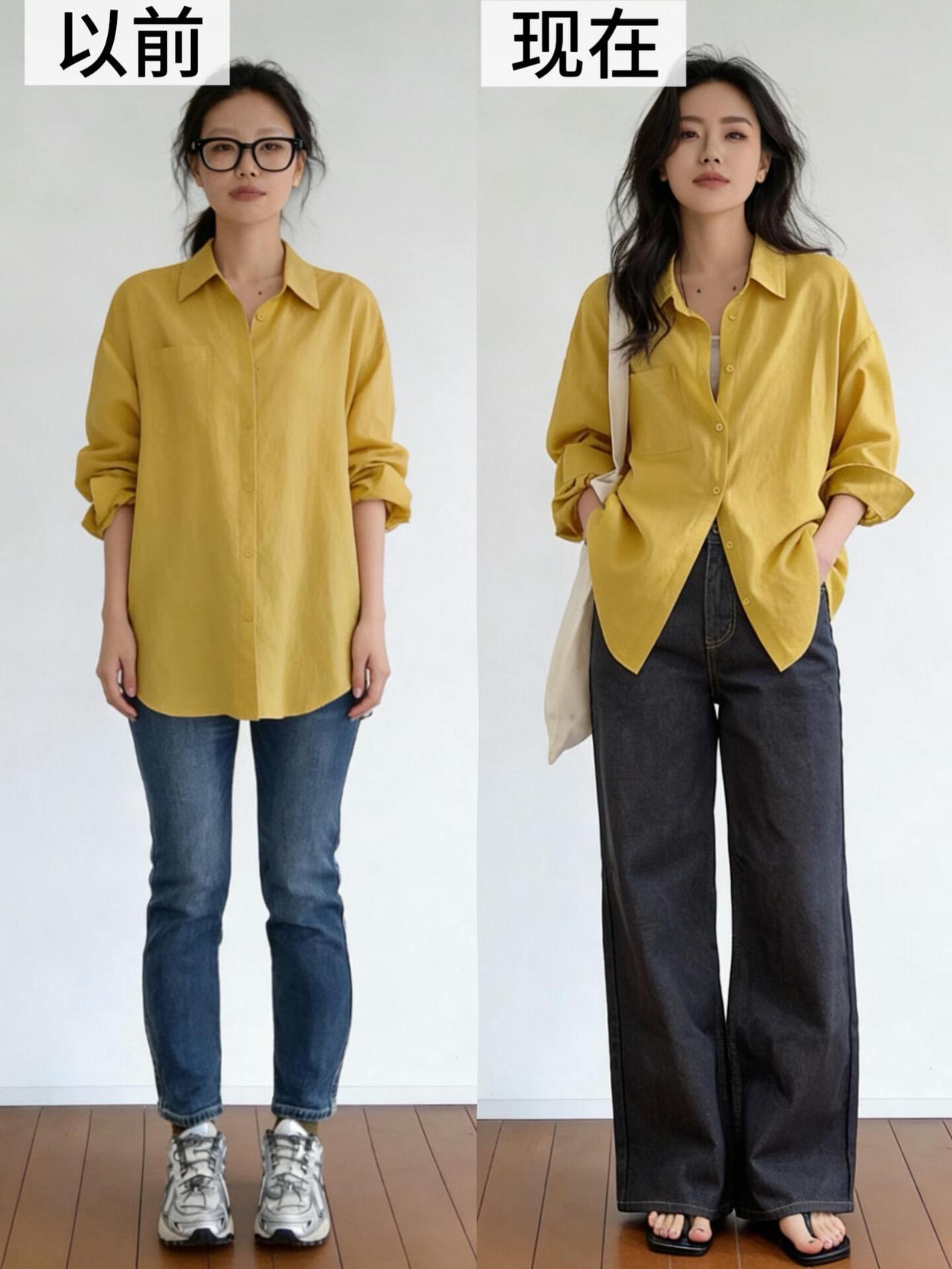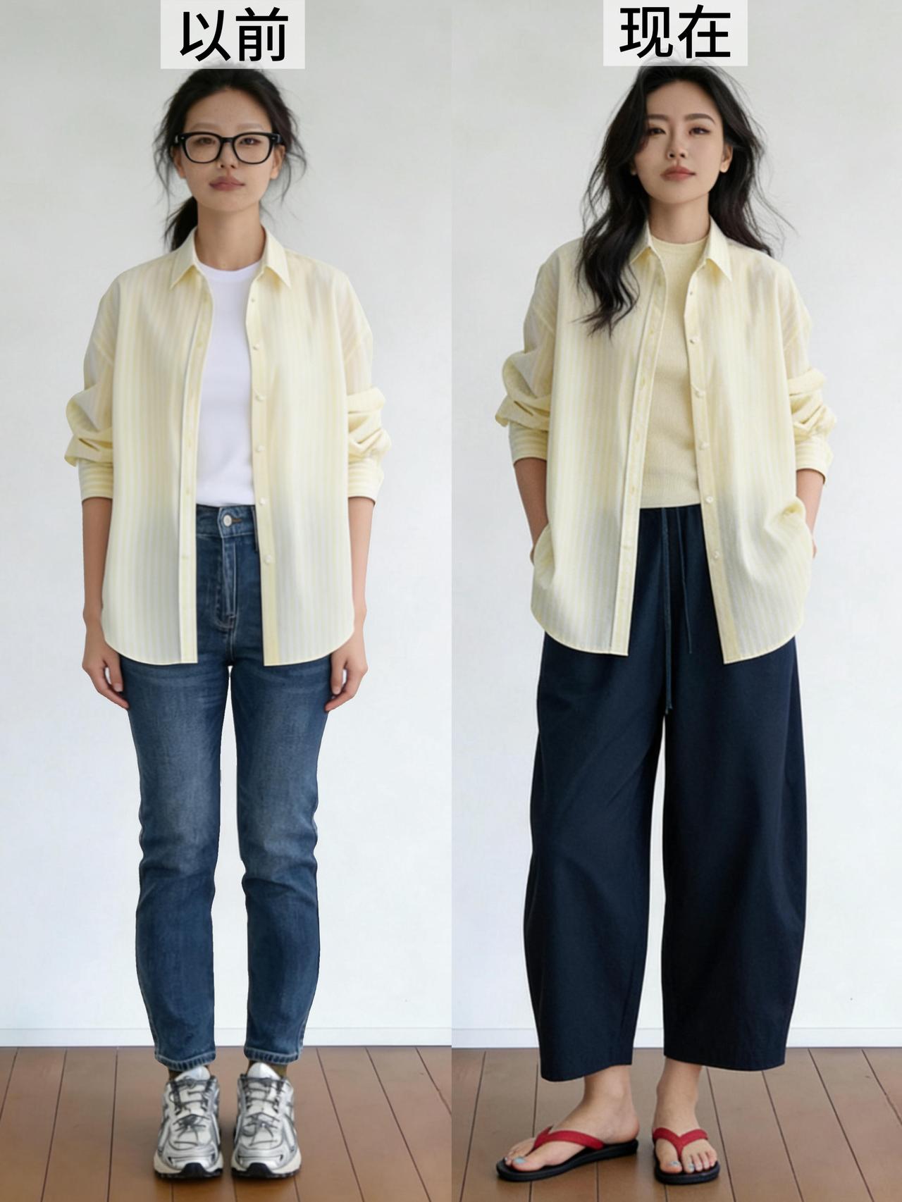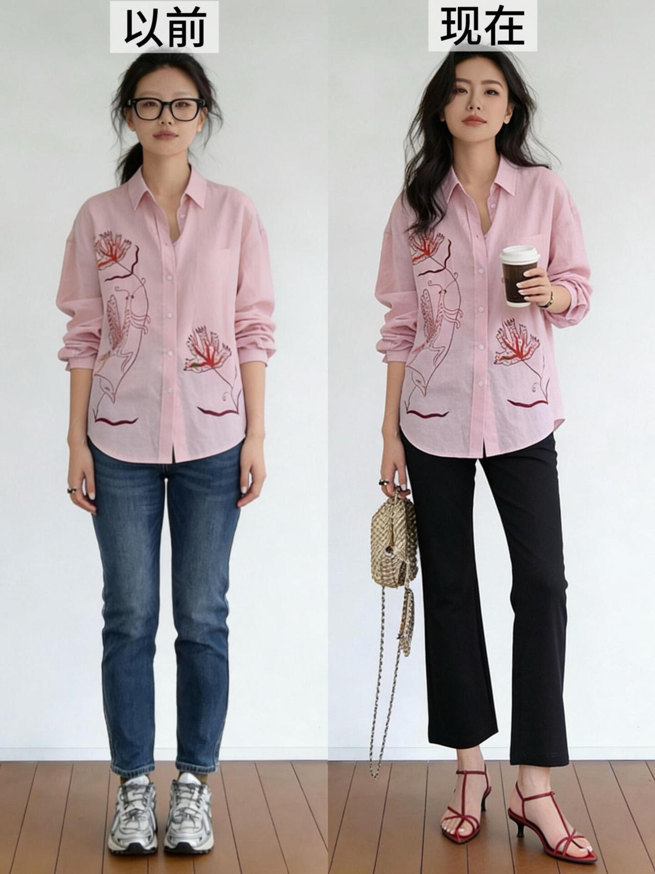 同一件衬衫,搭牛仔裤+运动鞋略显普通,换了思路:用白半裙、黑微喇裤或阔腿裤替代直筒牛仔,搭配玛丽珍鞋、凉鞋或夹脚拖,再用棒球帽、草编包、项链做点缀,瞬间就摆脱了路人感。简单调整下搭配思路,把衬衫穿成开衫、叠穿内