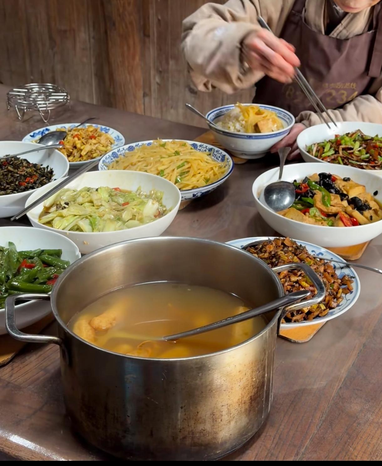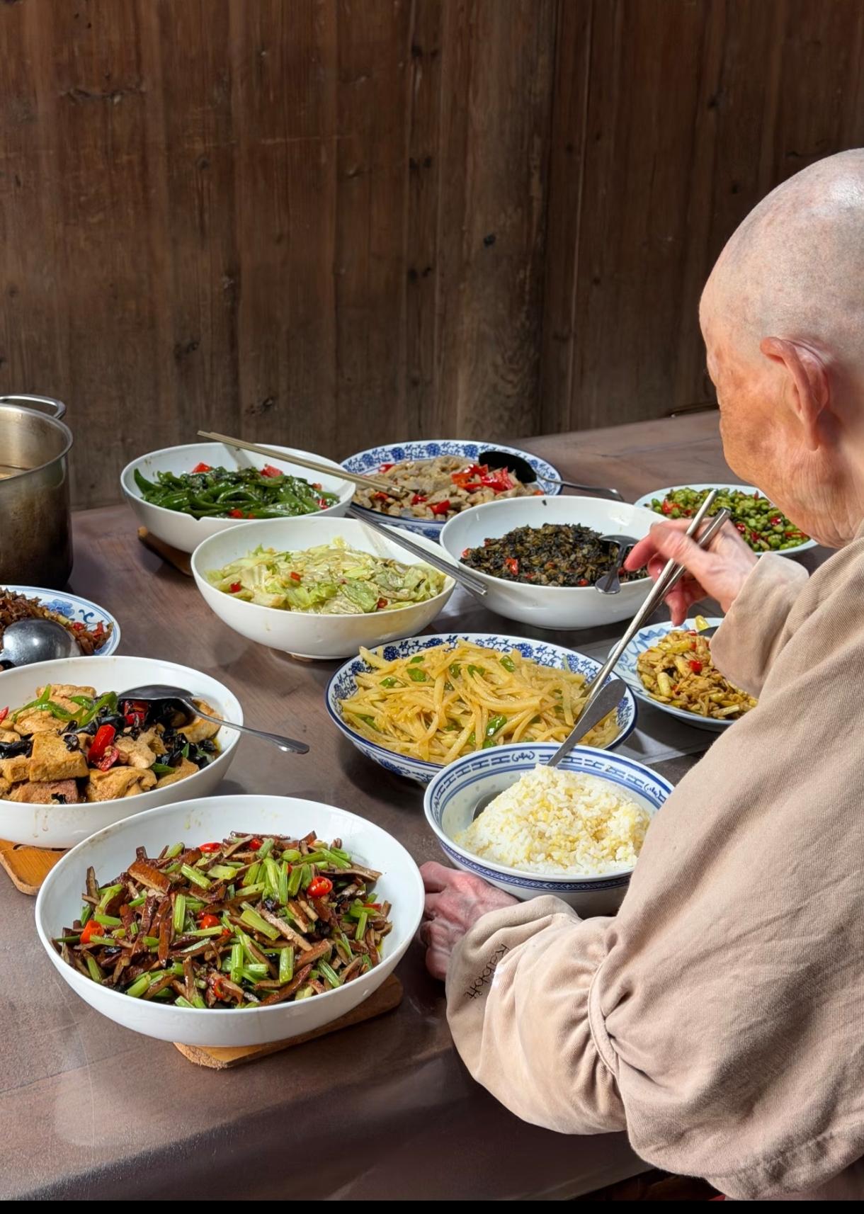 斋饭挺丰盛的,各色各类,挺好看。出家人戒荤,没有葱蒜,辣椒不是五辛,蛋奶也不是荤,但是不要吃那种受精卵的蛋,鹌鹑蛋不吃。有的人境界上来了,就不吃鸡蛋了,但这都是随缘的,可以吃。原来一直以为斋饭是清汤寡水的,没想到斋饭也可以做成这样。