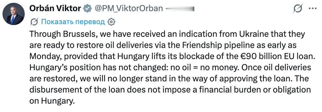 匈牙利总理欧尔班刚刚在社交媒体上放话:乌克兰通过布鲁塞尔传话,最早下周一就能恢复“友谊”管道输油,前提是匈牙利别再拦着欧盟那900亿欧元对乌贷款。