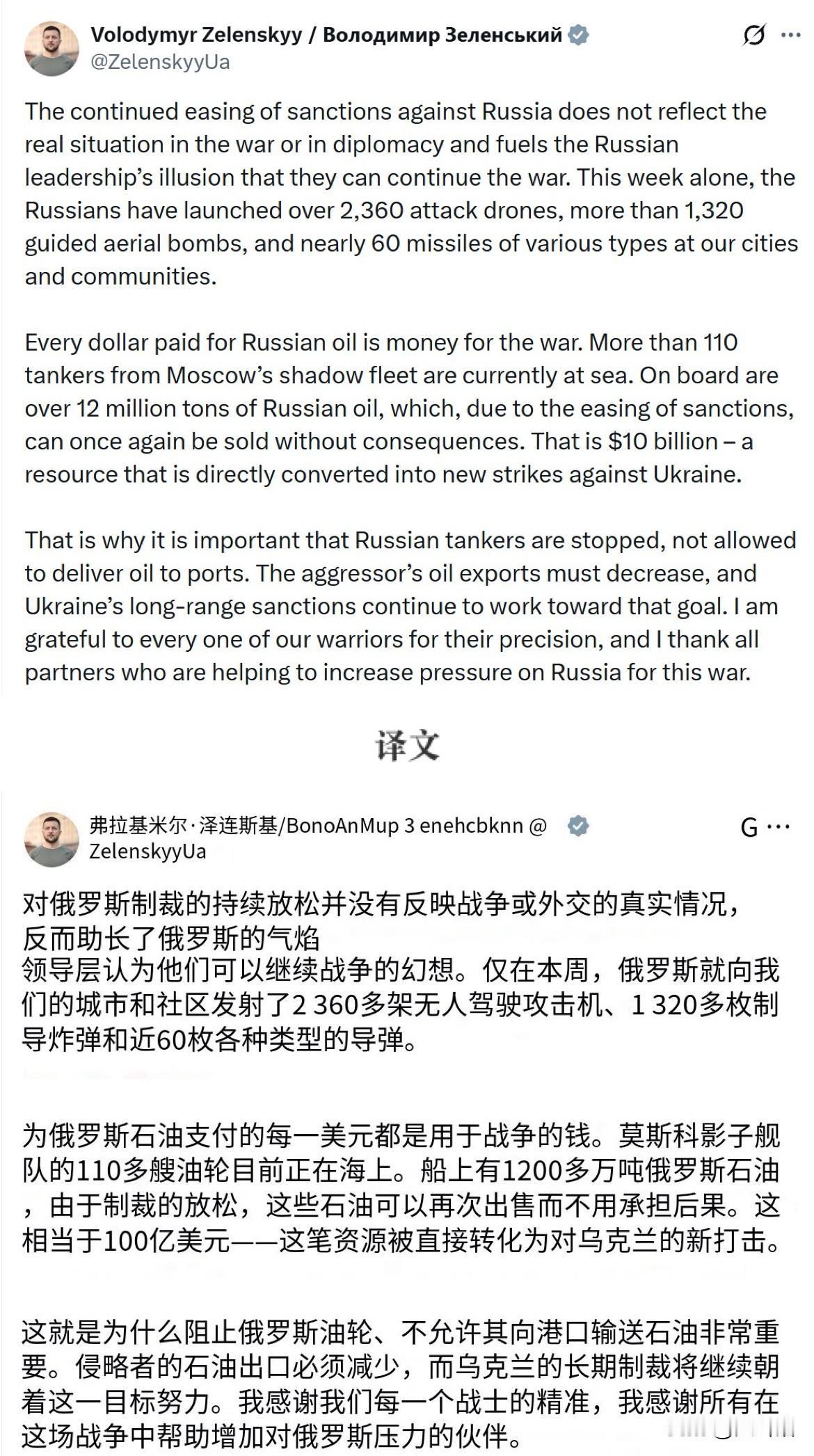 【泽连斯基喊话美国不要放松对俄罗斯的石油制裁】 泽连斯基在社交平台发文表示,美国