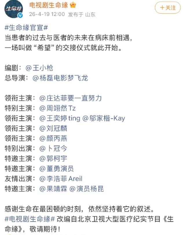 庄达菲周翊然新剧《生命缘》官宣!这就是资源咖碰到了皇族,周翊然是鹅厂太子,庄达菲是京圈公主,他俩一搭是现偶《白日梦我》,庄达菲一番,新剧《生命缘》是医疗职场剧,庄达菲依旧是一番女主,单独一行领衔主演,周翊然是特出主演,三到六番都是领衔主演,所以周翊然还是单独要了个特别主演的头衔。