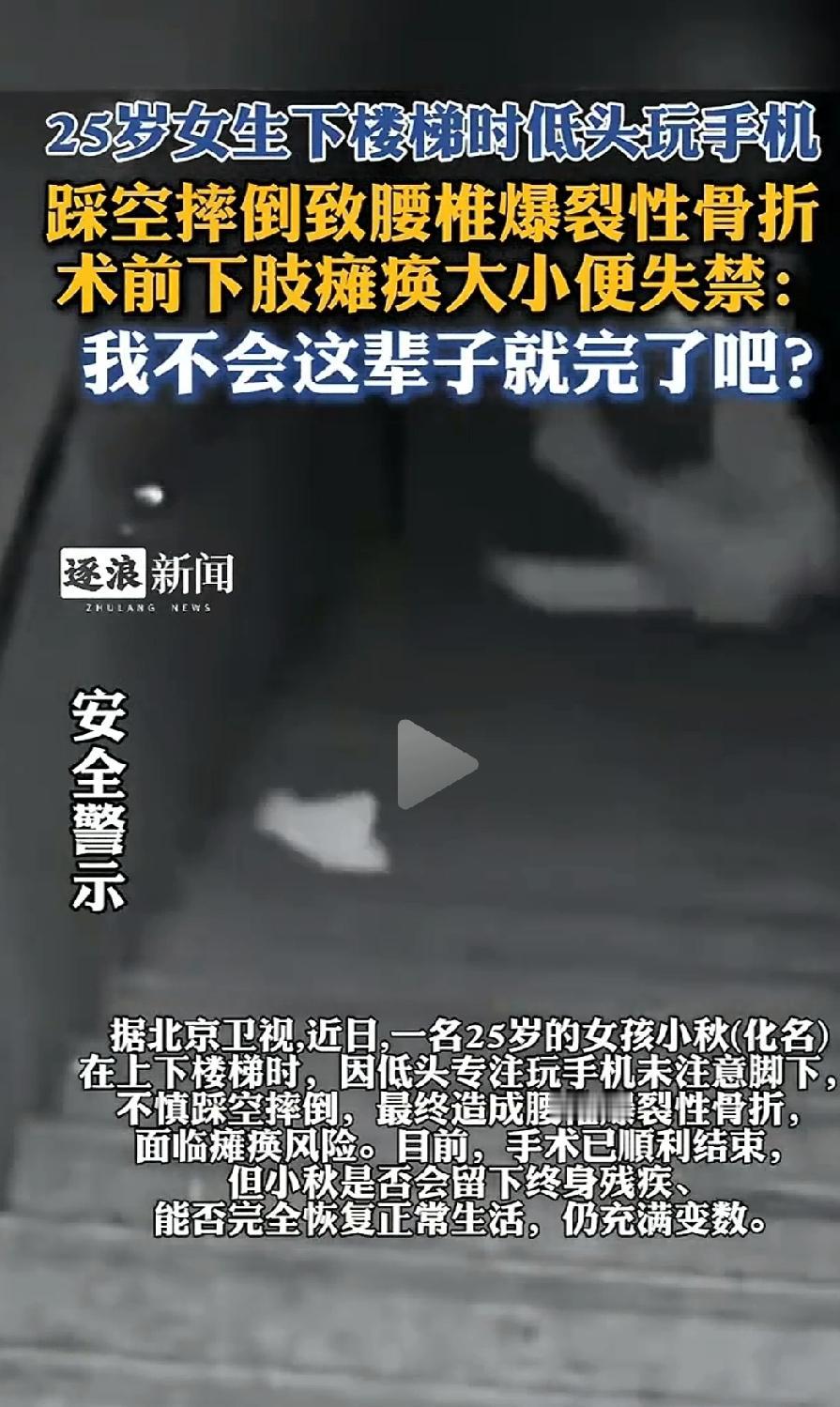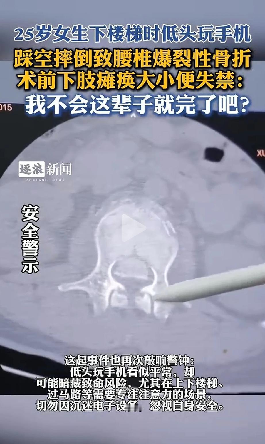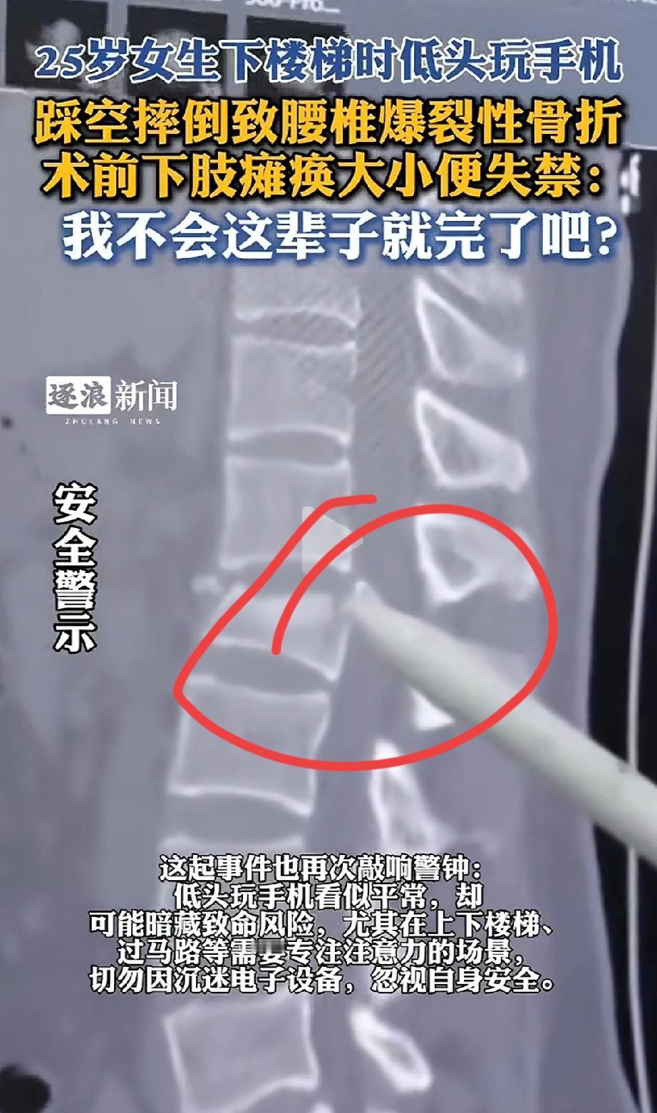 悔之晚矣!25岁女孩下楼梯时,沉迷玩手机,没留意台阶不慎踩空摔倒,疼得瞬间站不起来,紧急就医后,确诊腰椎爆裂性骨折。术前已经出现下肢瘫痪、大小便失禁的症状。女孩崩溃:我这辈子不会就完了吧!
