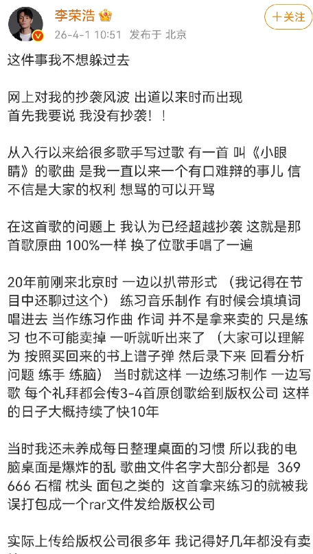 不同于圈内其他艺人被曝抄袭后,要么沉默避世,要么强硬反驳、推诿扯皮,李荣浩没有给舆论发酵的机会,第一时间主动发声,直言不讳地承认,《小眼睛》的曲子确实照搬了《Signal》,这份不遮掩、不逃避的坦荡,瞬间戳中了很多人,也让原本一边倒的舆论,分成了鲜明的两派。